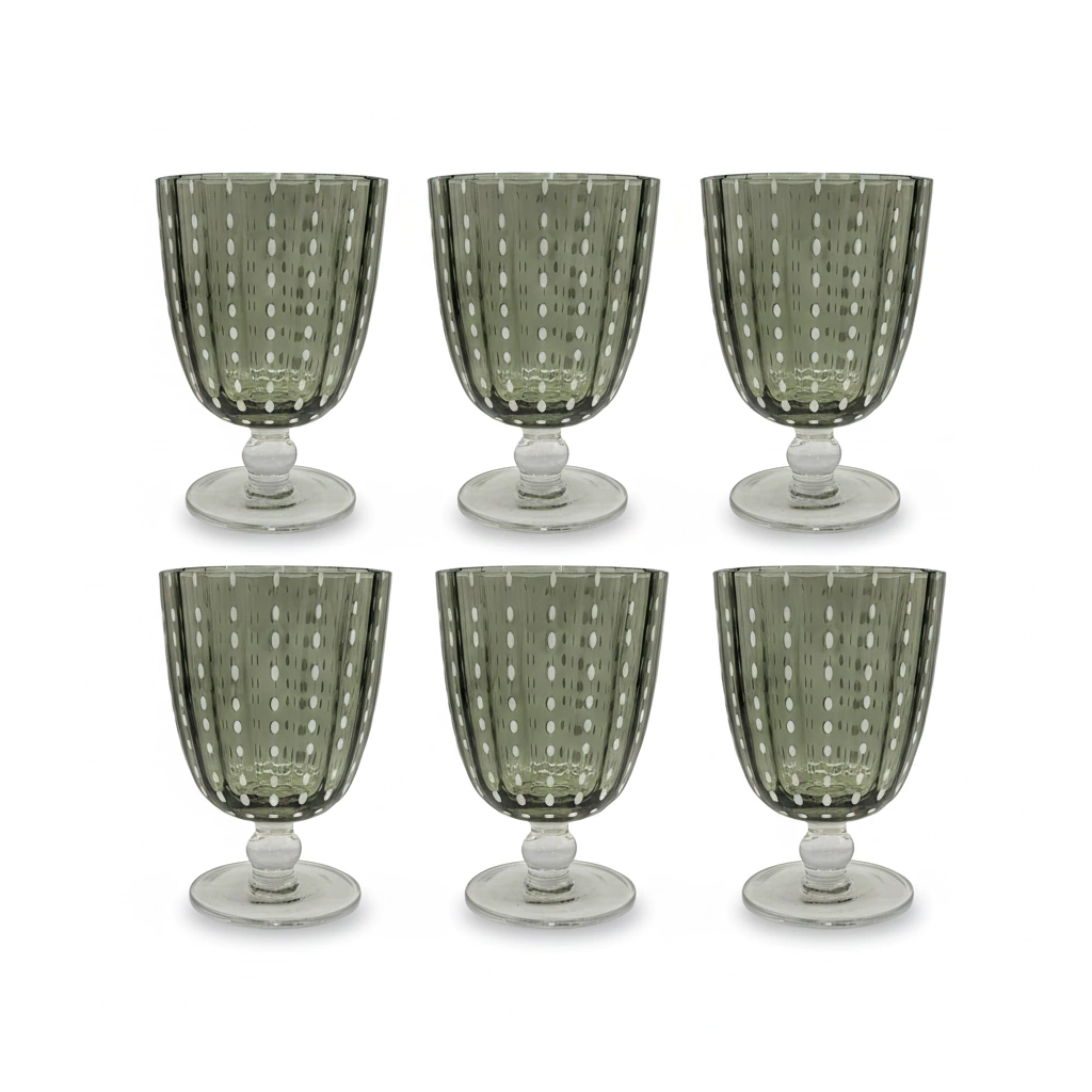 Cor e Padrão: Cada taça é confeccionada em vidro de tonalidade Verde Fumê (ou Musgo), um tom sofisticado e contemporâneo. A decoração é feita com o clássico padrão Poá (bolinhas) na cor Branca, conferindo um ar alegre e retrô.