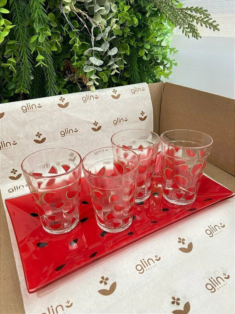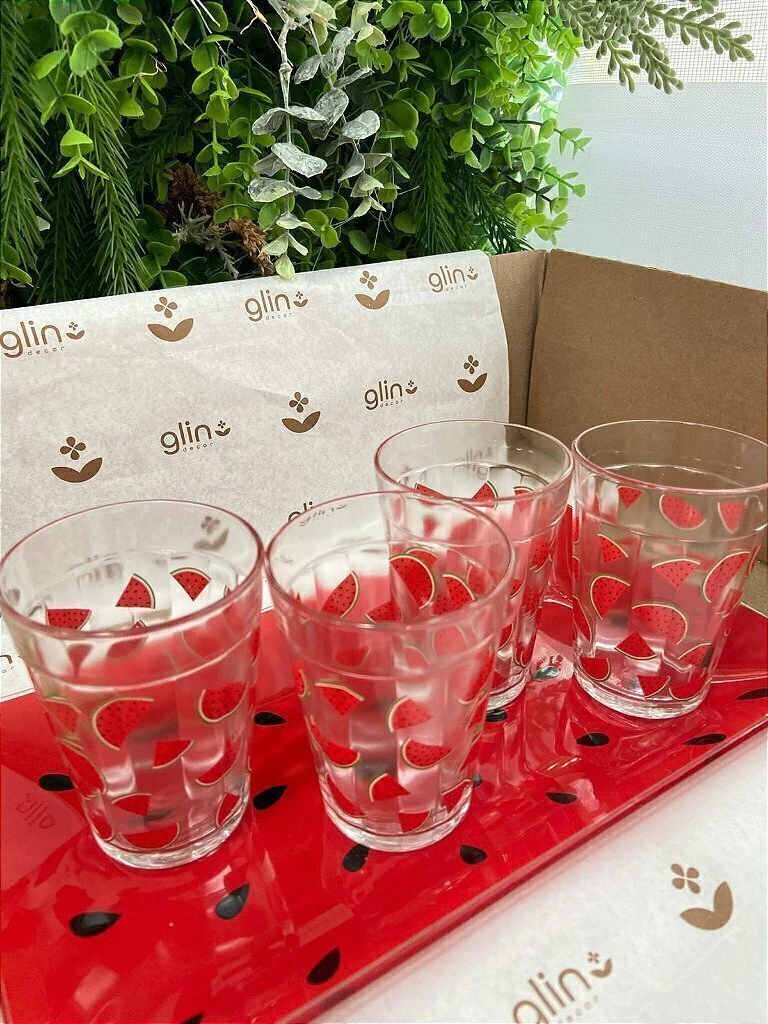 Este encantador kit Glin traz a leveza e a alegria do verão para a sua casa. Composto por quatro copos de vidro transparentes e 1 Travessa Retangular, cada um adornado com vibrantes e divertidas fatias de melancia em tons de vermelho e verde, este conjunto é perfeito para servir suas bebidas favoritas com um toque de frescor.