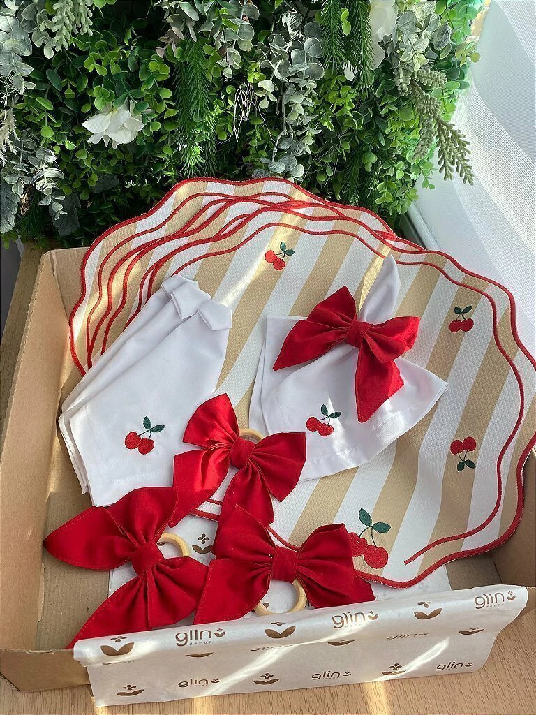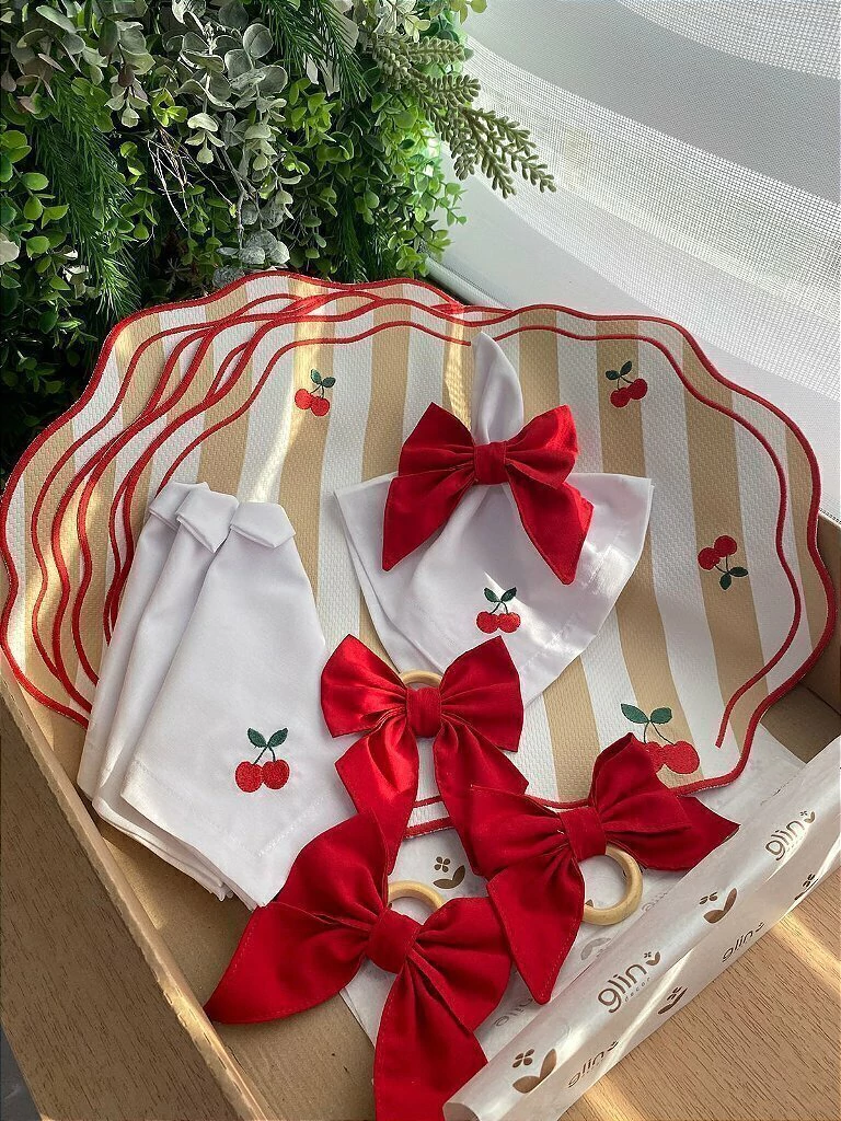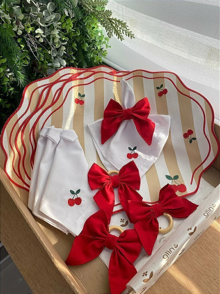 O Kit Mesa Cereja Charme é puro encanto! Com sua paleta em tons suaves de bege com listras e detalhes em vermelho, ele traz um ar leve e descontraído, perfeito para compor mesas cheias de personalidade e afeto. As cerejinhas bordadas adicionam um toque divertido e feminino, enquanto os laços vermelhos deixam tudo ainda mais especial.