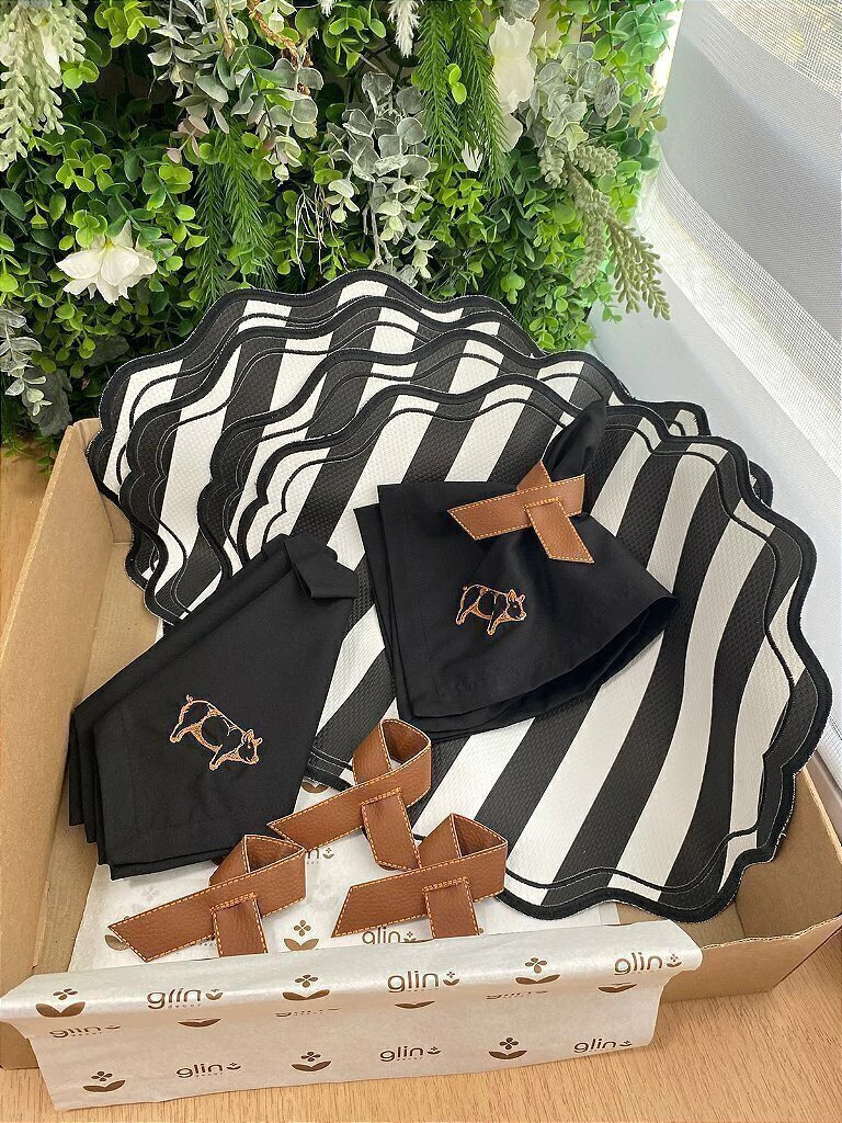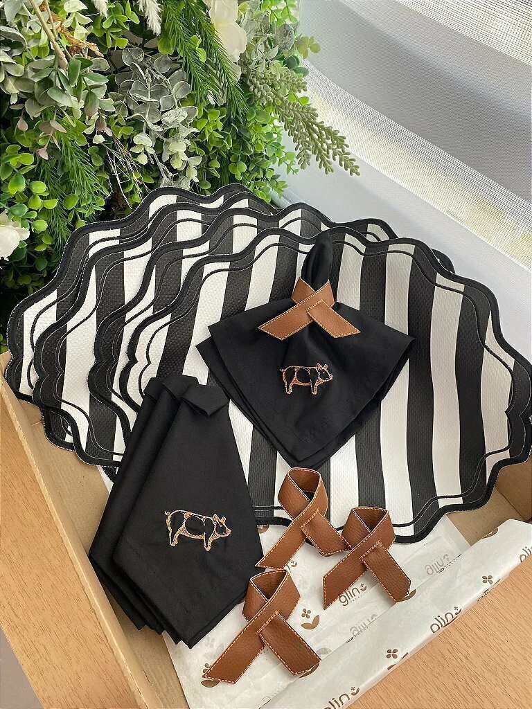 Este conjunto exclusivo é composto por 4 jogos americanos com um design marcante em listras preto e branco, proporcionando uma base elegante e contemporânea para sua mesa. Cada lugar é complementado por um guardanapo preto sofisticado, adornado com um charmoso bordado de um porquinho, adicionando um toque de originalidade e bom humor à sua experiência gastronômica.