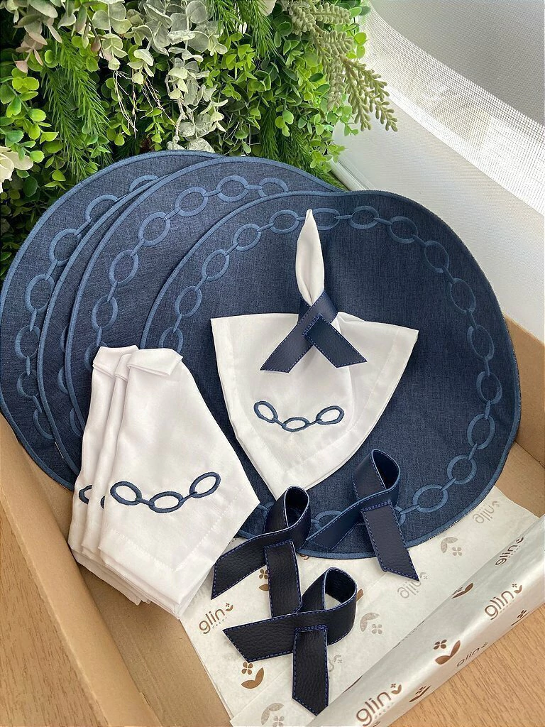 Composto por 4 jogos americanos redondos em um tom de Azul Marinho, cada peça é adornada com um delicado bordado de "elos" que se entrelaçam, simbolizando união e continuidade. Os 4 guardanapos que acompanham o kit são brancos, complementando o visual e também apresentando um bordado do mesmo "elo", criando um conjunto coeso e sofisticado.