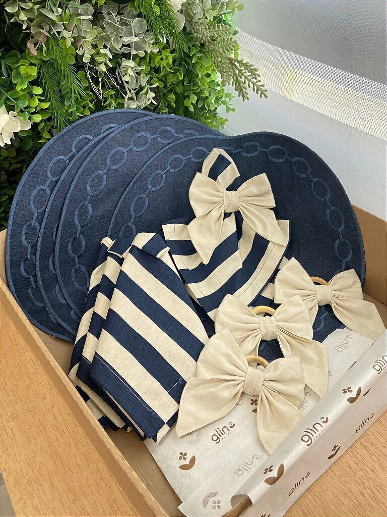 Navegue por uma atmosfera de elegância e frescor com o Kit Mesa Elos do Mar! Inspirado nos tons e texturas das paisagens litorâneas, ele combina sofisticação e leveza em cada detalhe. Os jogos americanos redondos com estampa de elos em azul profundo remetem ao movimento das ondas e à força do oceano, enquanto os guardanapos em linho listrado azul e bege trazem um toque náutico e acolhedor. O acabamento com laços em linho bege completa a composição com charme natural.