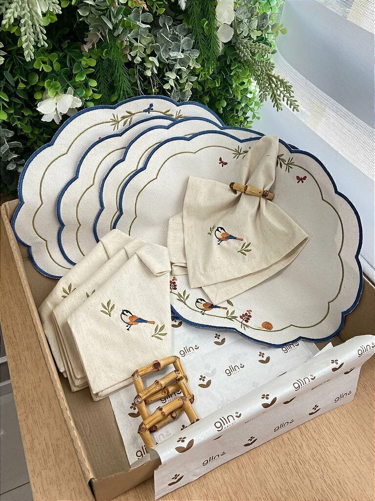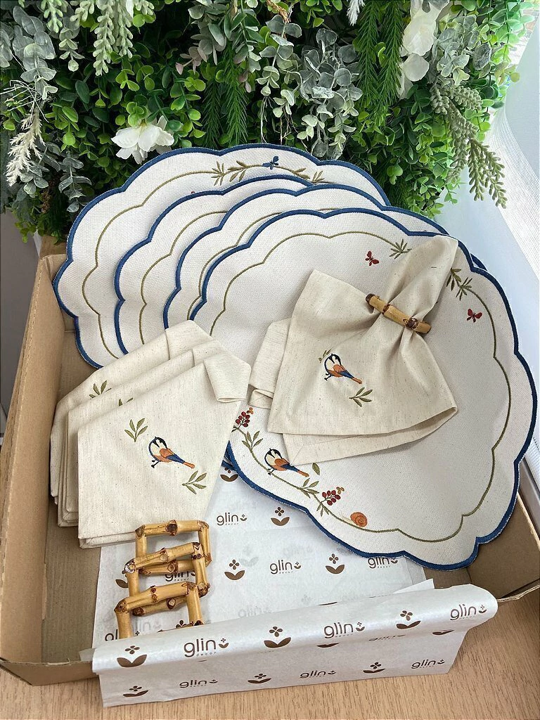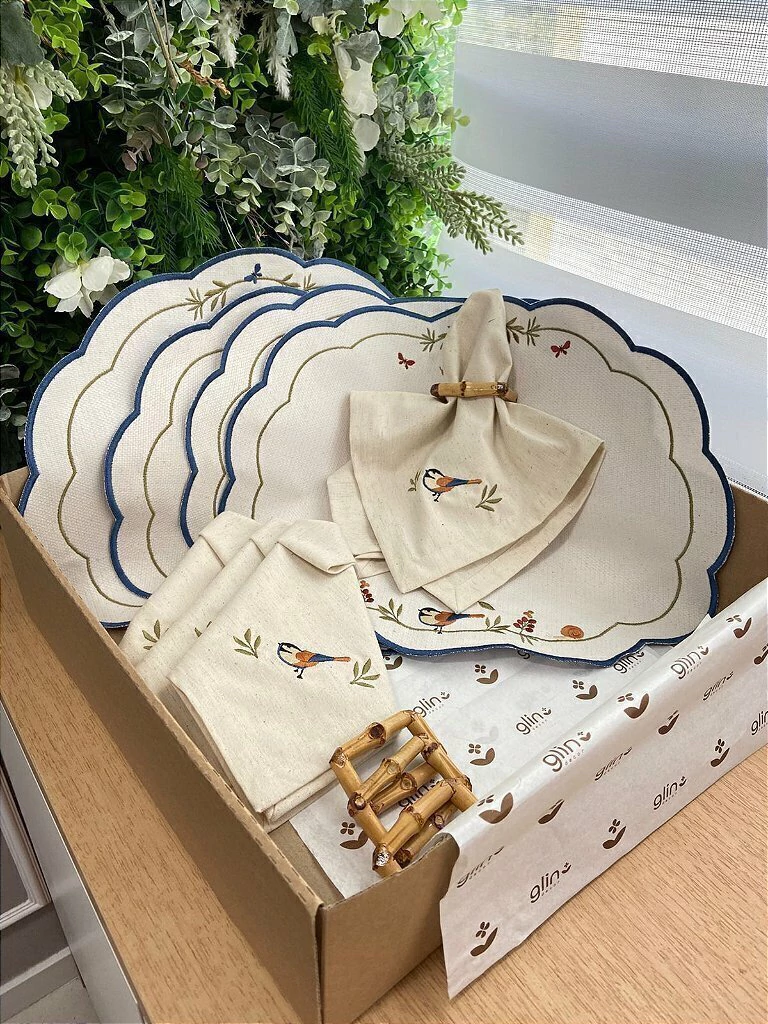 Transforme suas refeições em momentos de aconchego e beleza natural com o Kit Encanto dos Pássaros. Inspirado na leveza da natureza, cada peça traz bordados delicados de passarinhos, flores e folhagens, criando uma atmosfera serena e acolhedora à mesa.