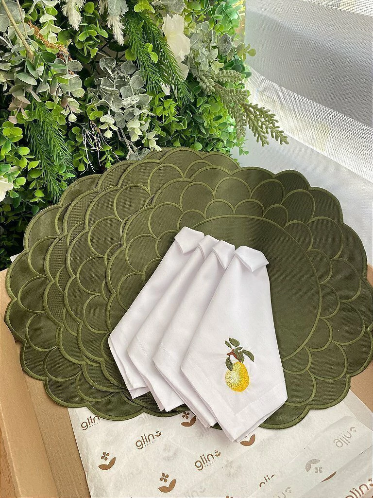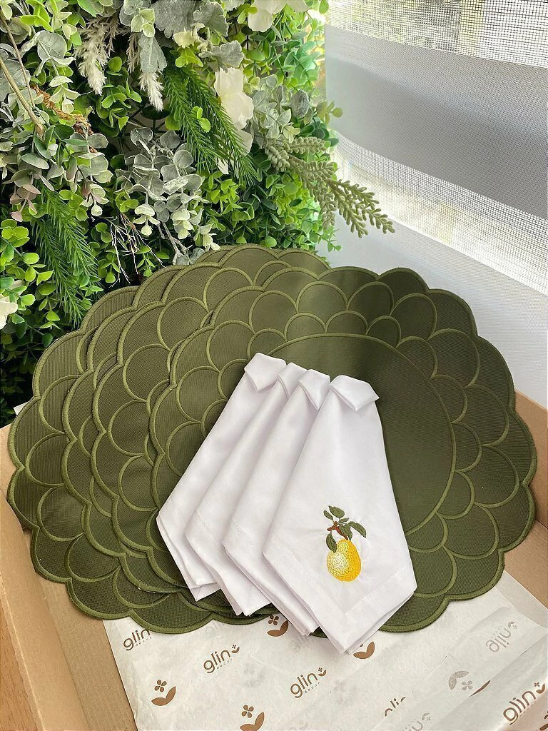 O Kit Mesa Frescor Cítrico traz o toque leve e ensolarado do limão siciliano para a sua mesa posta. Com jogos americanos redondos em verde musgo, que remetem à natureza e ao frescor do campo, e guardanapos bordados com limões sicilianos delicados, esse conjunto transforma qualquer refeição em uma experiência cheia de sabor e alegria.