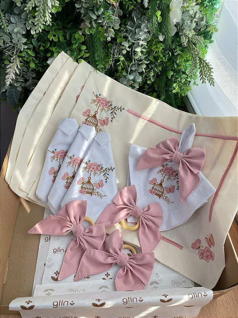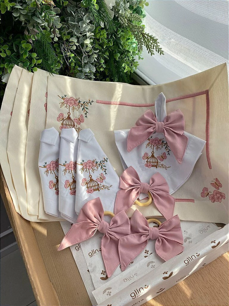 O Kit Mesa Jardim dos Sonhos traz toda a leveza e delicadeza da primavera para dentro do seu lar. Com bordados encantadores de flores, borboletas e gaiolas douradas, ele transforma qualquer refeição em um momento mágico. Os tons suaves de creme e rosa, aliados aos laços delicados, criam uma atmosfera romântica e sofisticada.