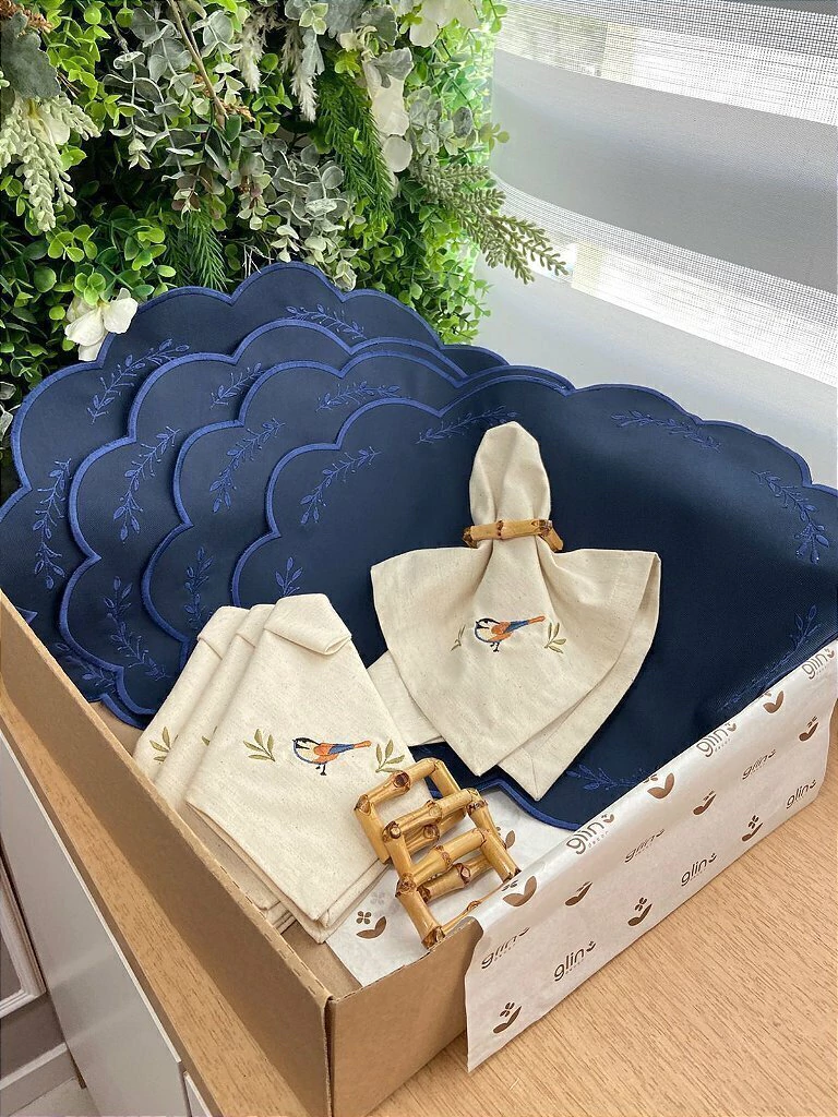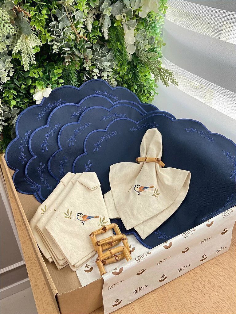 Leve o frescor e o encanto da natureza para sua mesa com o Kit Jardim Secreto Azul. Com jogos americanos em tom de Azul Marinho e bordados delicados de folhagens, este kit é um convite para momentos de tranquilidade e sofisticação.