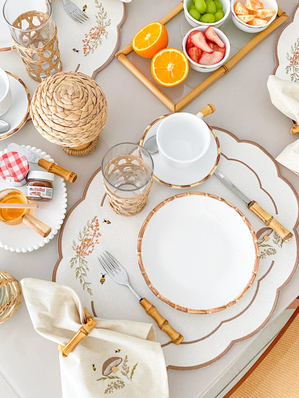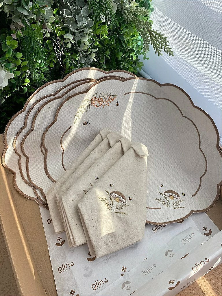 Este kit exclusivo foi meticulosamente criado para trazer a delicadeza e a suavidade dos elementos naturais para a sua mesa. Ele é composto por 4 jogos americanos com um design ondulado e um tom natural de linho, sutilmente bordados com charmosos cogumelos e abelhinhas, que conferem um toque lúdico e campestre à sua decoração. Complementando a atmosfera de floresta encantada, 4 guardanapos em linho, também com bordados de cogumelos e abelhinhas, adicionam um toque de leveza e harmonia ao conjunto, convidando a um mergulho na natureza.