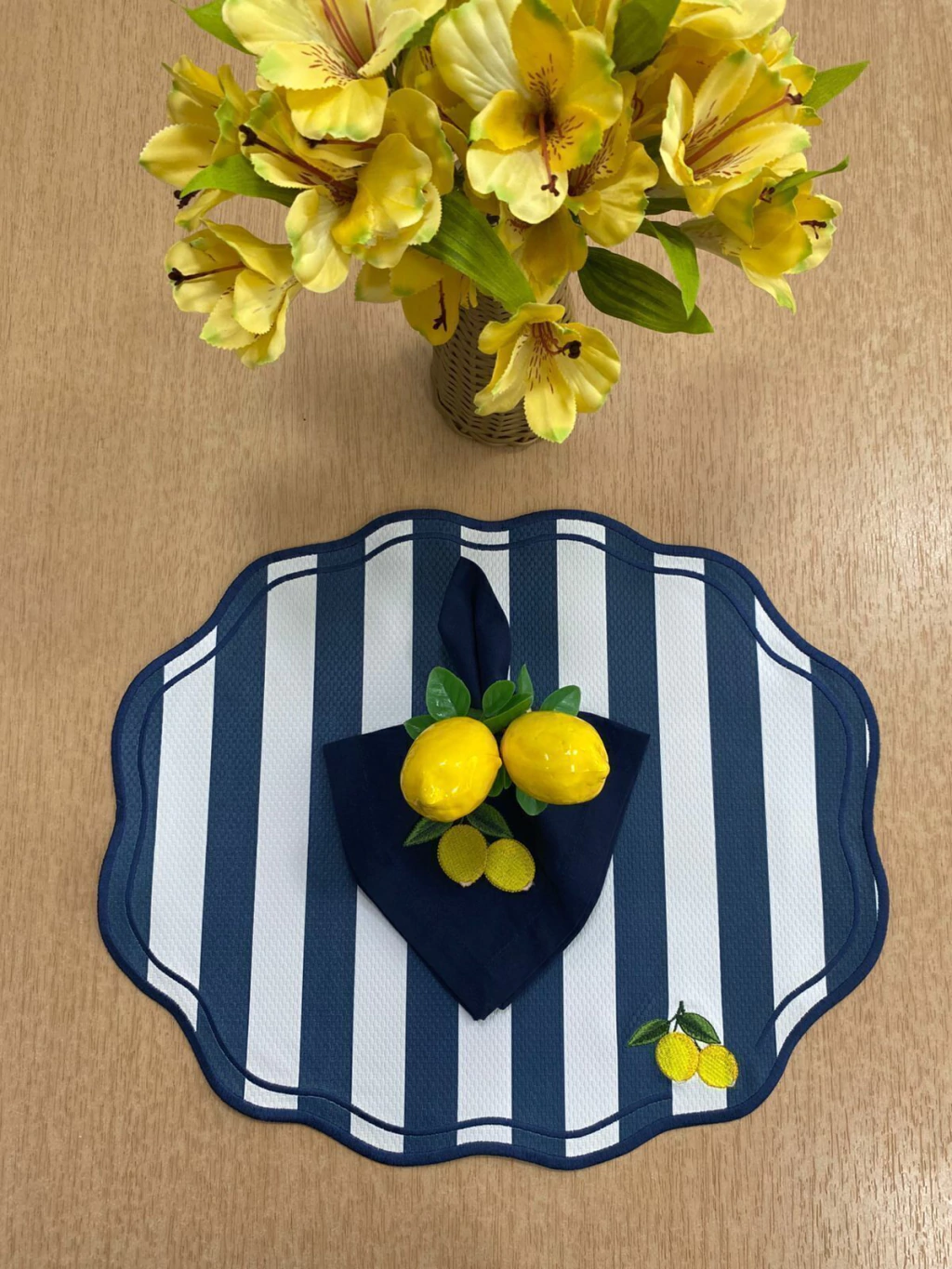 1 Lugar Americano listrado: com design em listras azuis e brancas, que remete ao estilo náutico, e um detalhe sutil de limões bordados na lateral, criando um visual sofisticado e moderno.