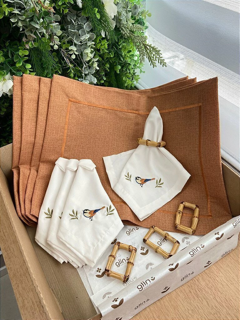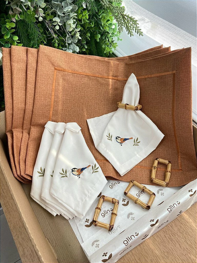 Com jogos americanos em tom terracota e acabamento refinado, o kit ganha vida com guardanapos bordados com delicados passarinhos e folhas. Os porta-guardanapos em bambu natural completam o visual com um toque artesanal e sofisticado.
