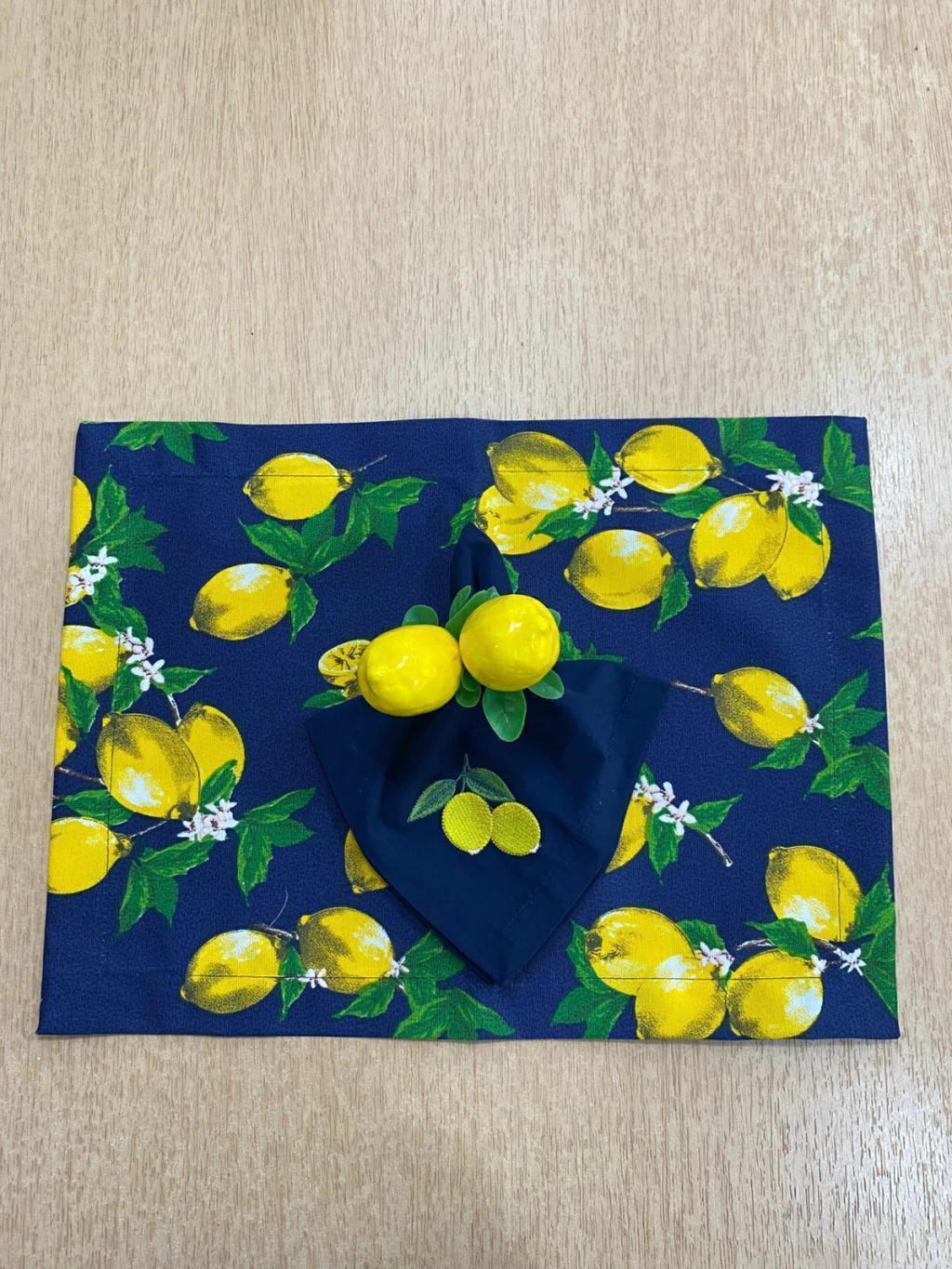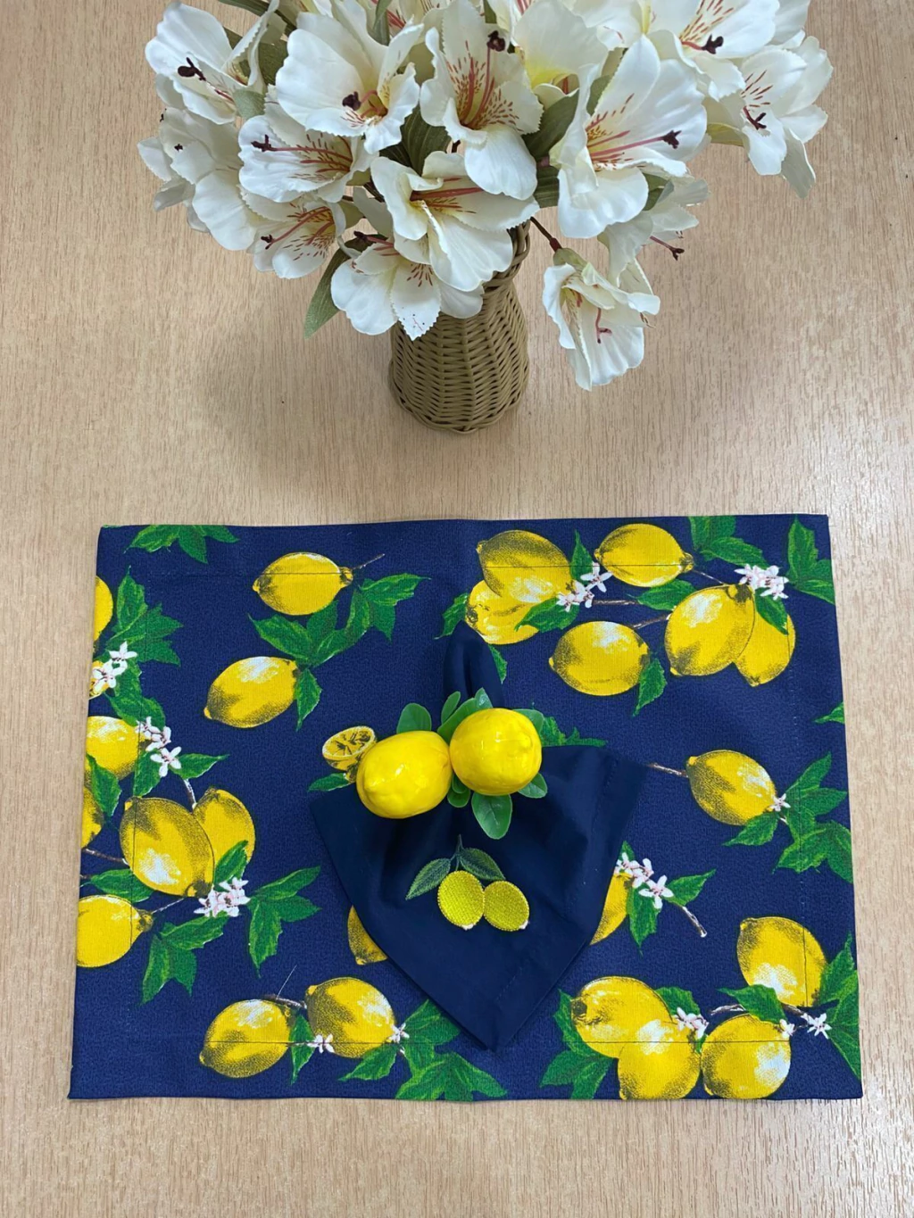 O kit inclui um lugar americano retangular com uma estampa alegre de limões sicilianos em contraste com o azul marinho. O conjunto é complementado por um guardanapo de tecido azul marinho com um delicado bordado de dois limões, que adiciona um toque artesanal e um porta guardanapo limões sofisticando à composição. Juntos, eles criam uma atmosfera leve e elegante que remete à beleza da costa italiana.