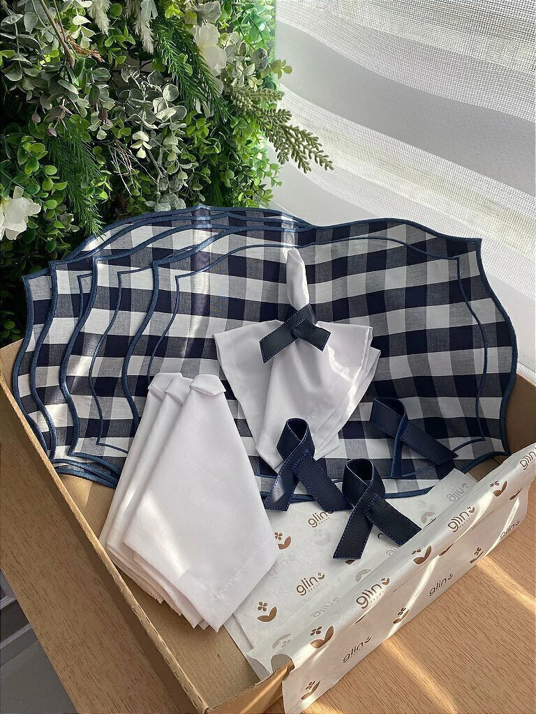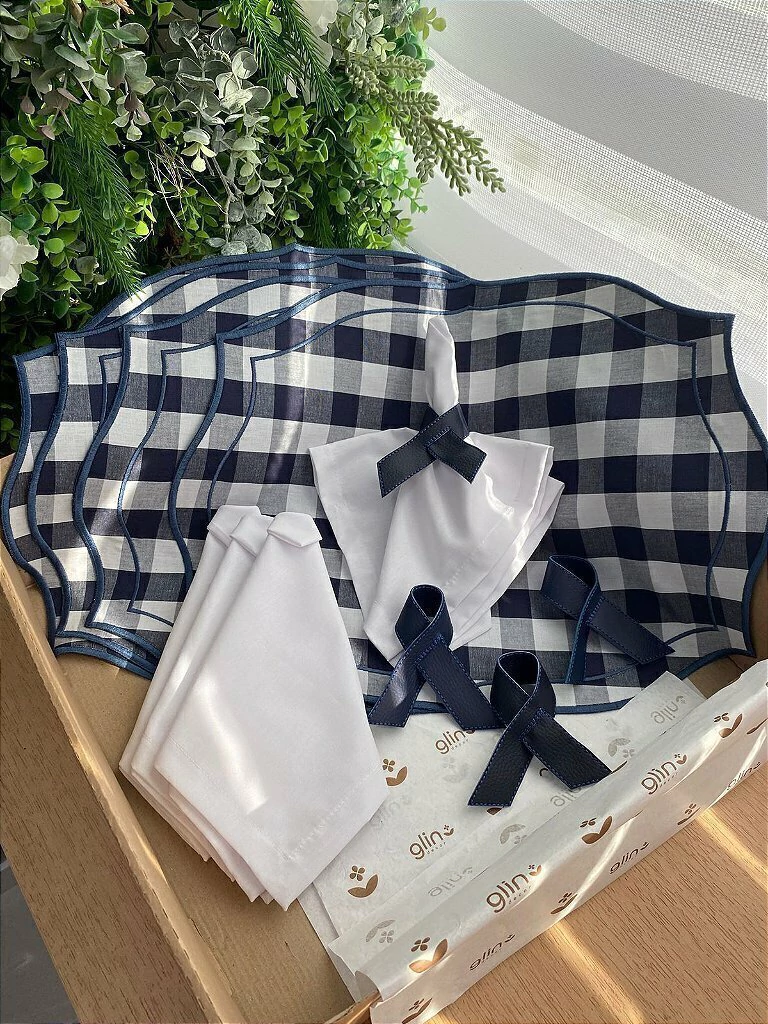 Para completar a composição, o kit inclui 4 guardanapos lisos na cor branca, que trazem leveza e um toque de requinte. E para arrematar com estilo, 4 porta-guardanapos em laço de courino azul adicionam um acabamento sofisticado e harmonioso ao conjunto.