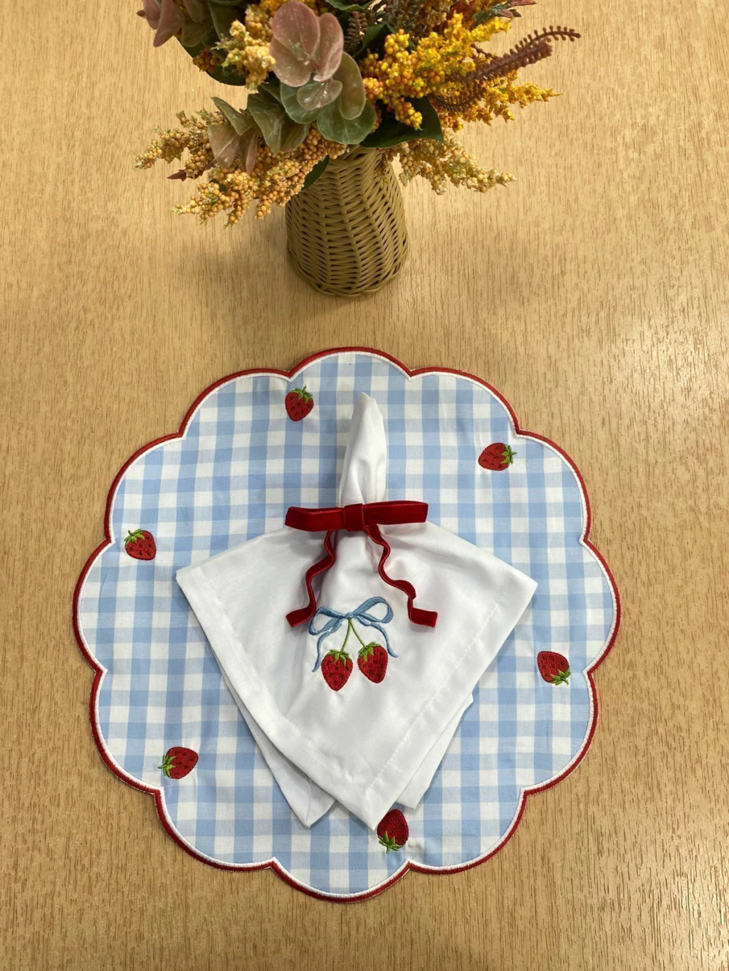 Encante sua mesa com o charme delicado do Kit Moranguinho Azul Bordado – 3 Peças. Composto por um lugar americano redondo em tecido xadrez azul com acabamento em borda ondulada e bordados de moranguinhos, guardanapo branco com detalhe bordado e um porta-guardanapo com laço em veludo vermelho, este kit traz um toque doce e acolhedor à sua mesa posta. Ideal para momentos especiais, cafés da manhã encantadores ou piqueniques com estilo, ele une delicadeza, cor e alegria em cada detalhe.