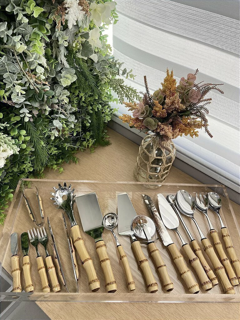 Transforme suas refeições e celebrações com a beleza natural e a praticidade do nosso Kit Completo Servir 18 Peças em Bambu. Cada peça, cuidadosamente confeccionada em bambu sustentável, adiciona um toque de sofisticação rústica à sua mesa. O kit inclui tudo o que você precisa para servir com estilo: