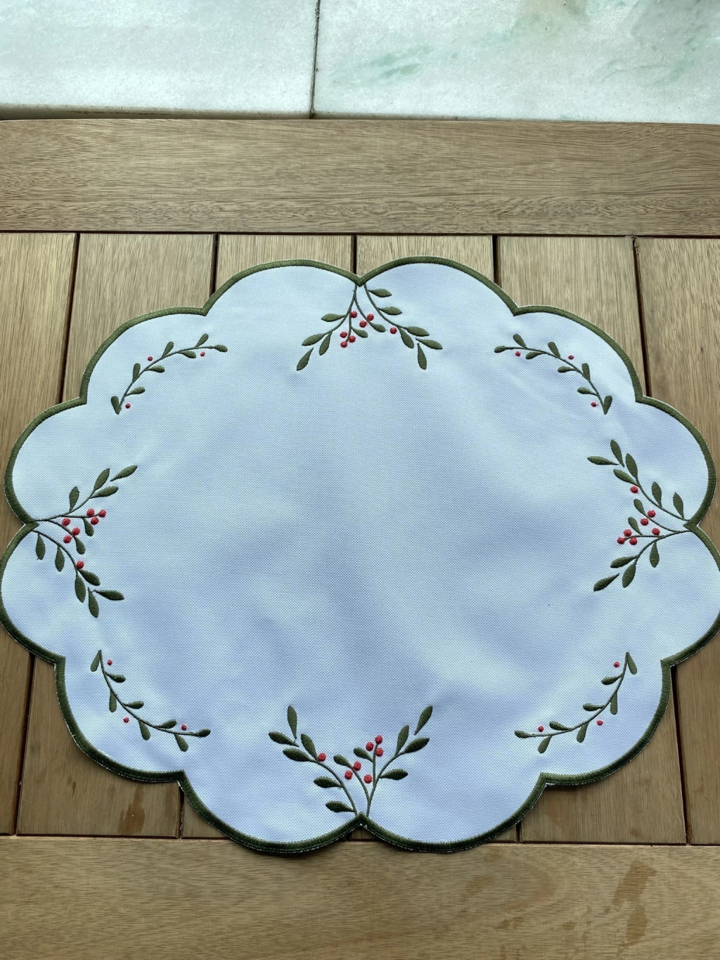 O ponto focal é o bordado de azevinho e frutos vermelhos, elegantemente distribuído ao longo do contorno: