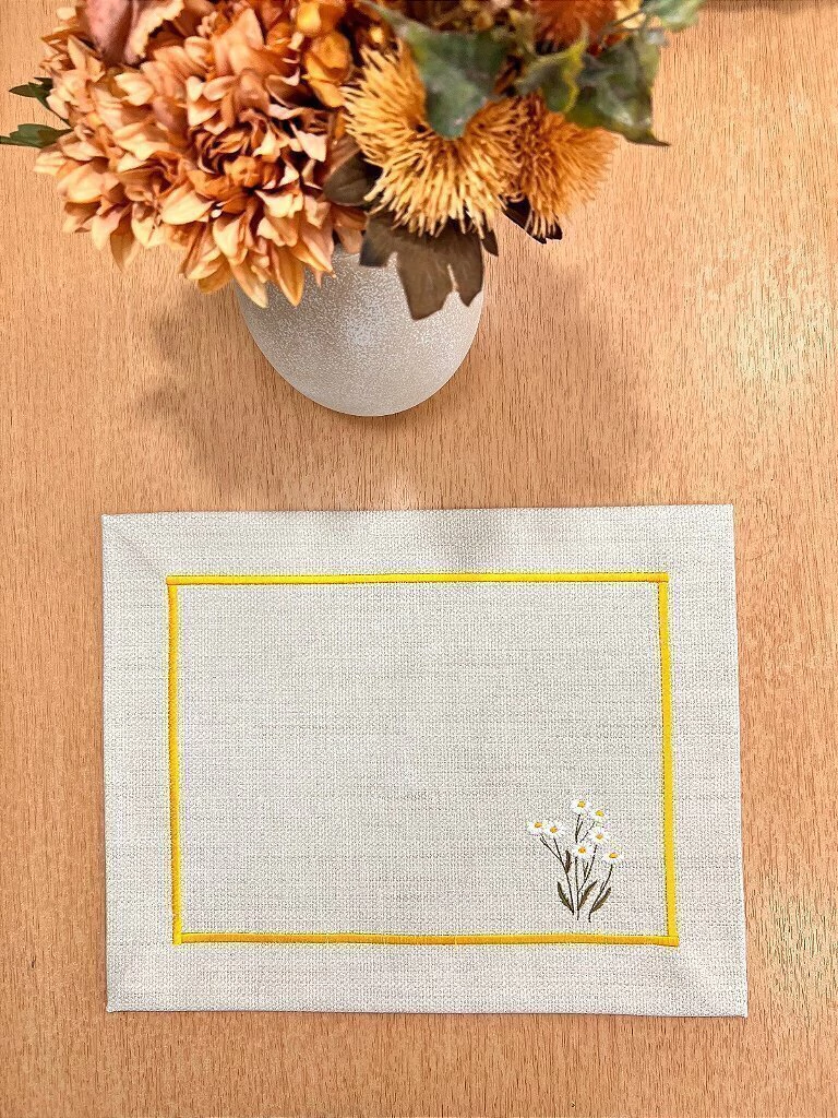 O Lugar Americano Bordado Glin Flowers Amarelo traz um toque alegre e sofisticado à sua mesa. Com um delicado bordado de flores e uma cor vibrante de amarelo, ele é perfeito para transformar suas refeições em momentos ainda mais especiais, seja ao receber amigos e familiares ou no dia a dia.