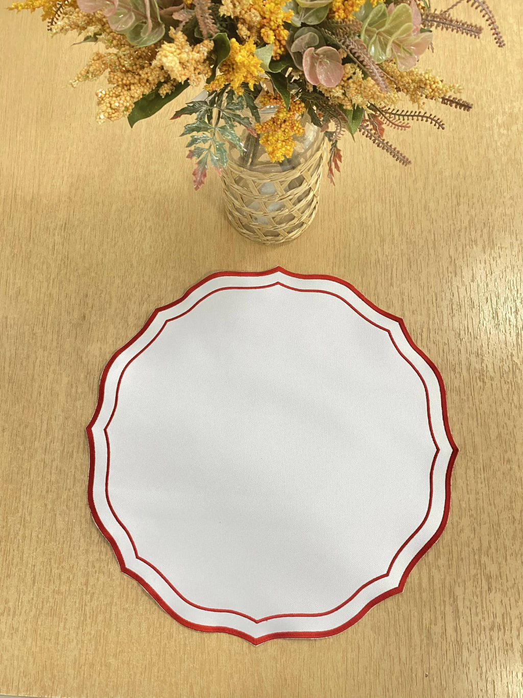 A cor predominante é branca, proporcionando uma base neutra que realça a louça e os talheres. A borda em um vibrante tom de vermelho escuro cria um contraste marcante, que traz sofisticação e um toque de cor.
