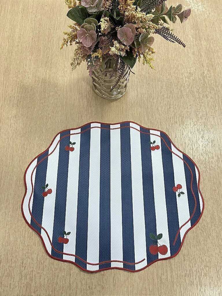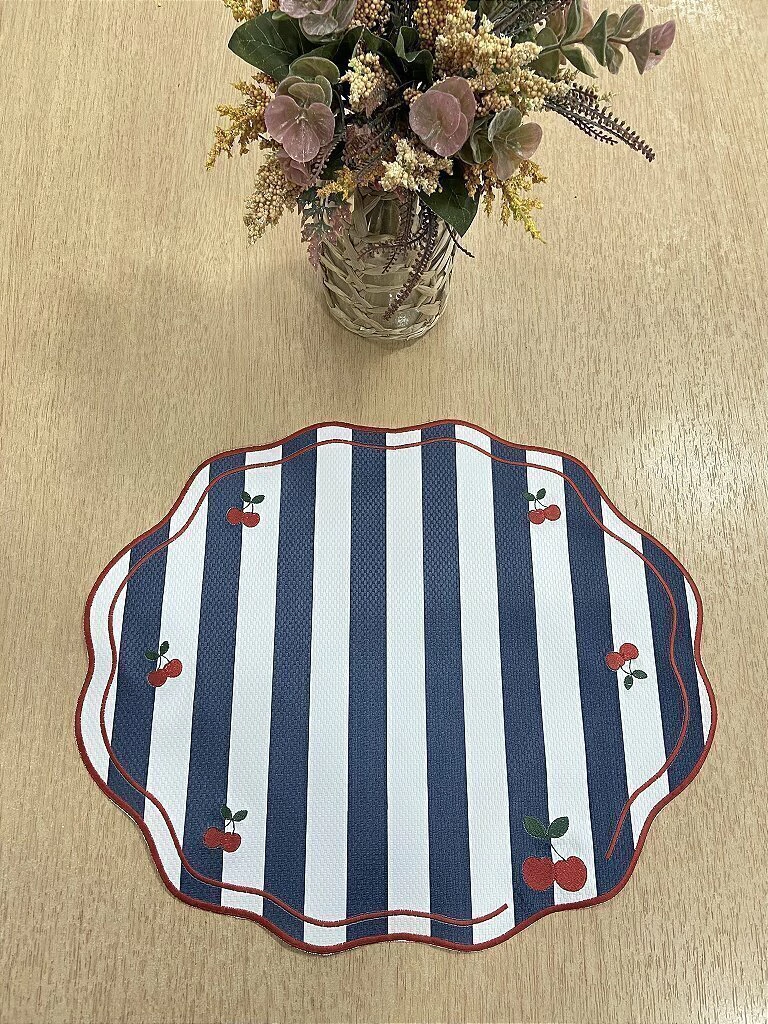 Confeccionado com materiais de alta qualidade, este lugar americano é resistente e fácil de limpar, protegendo sua mesa com estilo. As cerejas salpicadas sobre o fundo listrado azul criam um contraste encantador, adicionando um toque de cor e vivacidade à sua decoração.