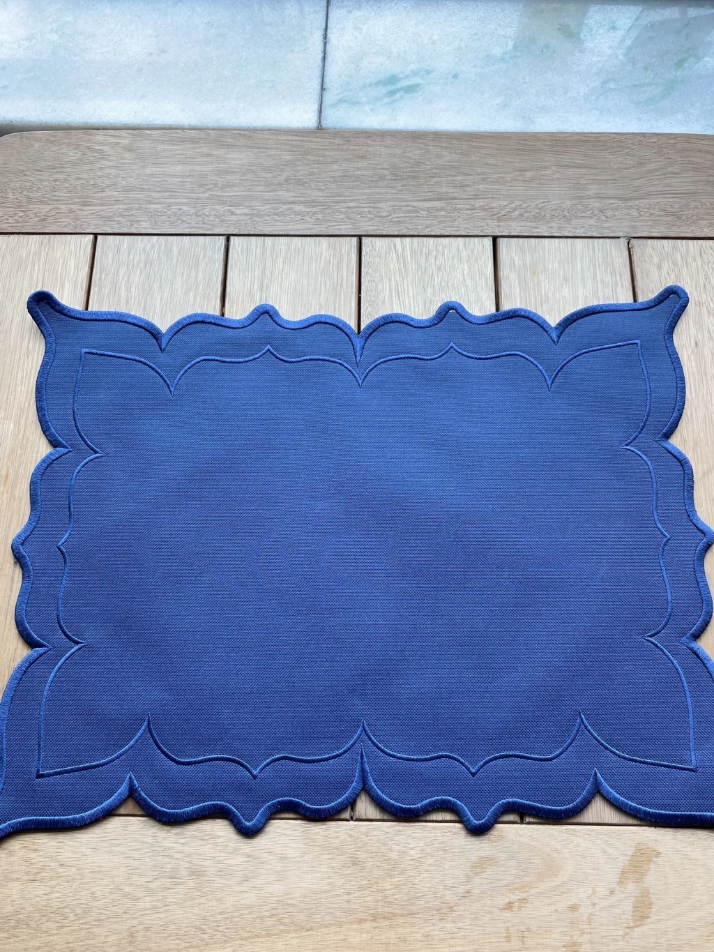 Acabamento de Contorno: O formato elegante é realçado por uma costura ou aplicação de viés em um tom de azul muito próximo ao tecido (tom sobre tom). Este acabamento sutil cria a ilusão de profundidade e garante que o design ornamentado da borda se destaque com refinamento.