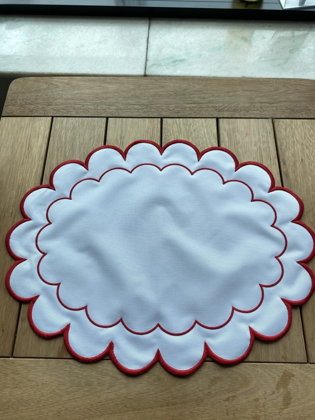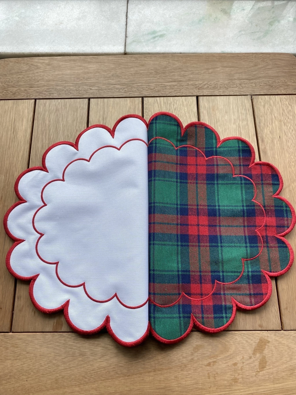 Face Neve e Escarlate: O lado oposto é em branco ou off-white, liso e neutro, contornado pela mesma borda vermelha. Esta face é ideal para um visual mais clean e moderno, permitindo que a louça roube a cena, ou para combinar com toalhas de mesa coloridas.