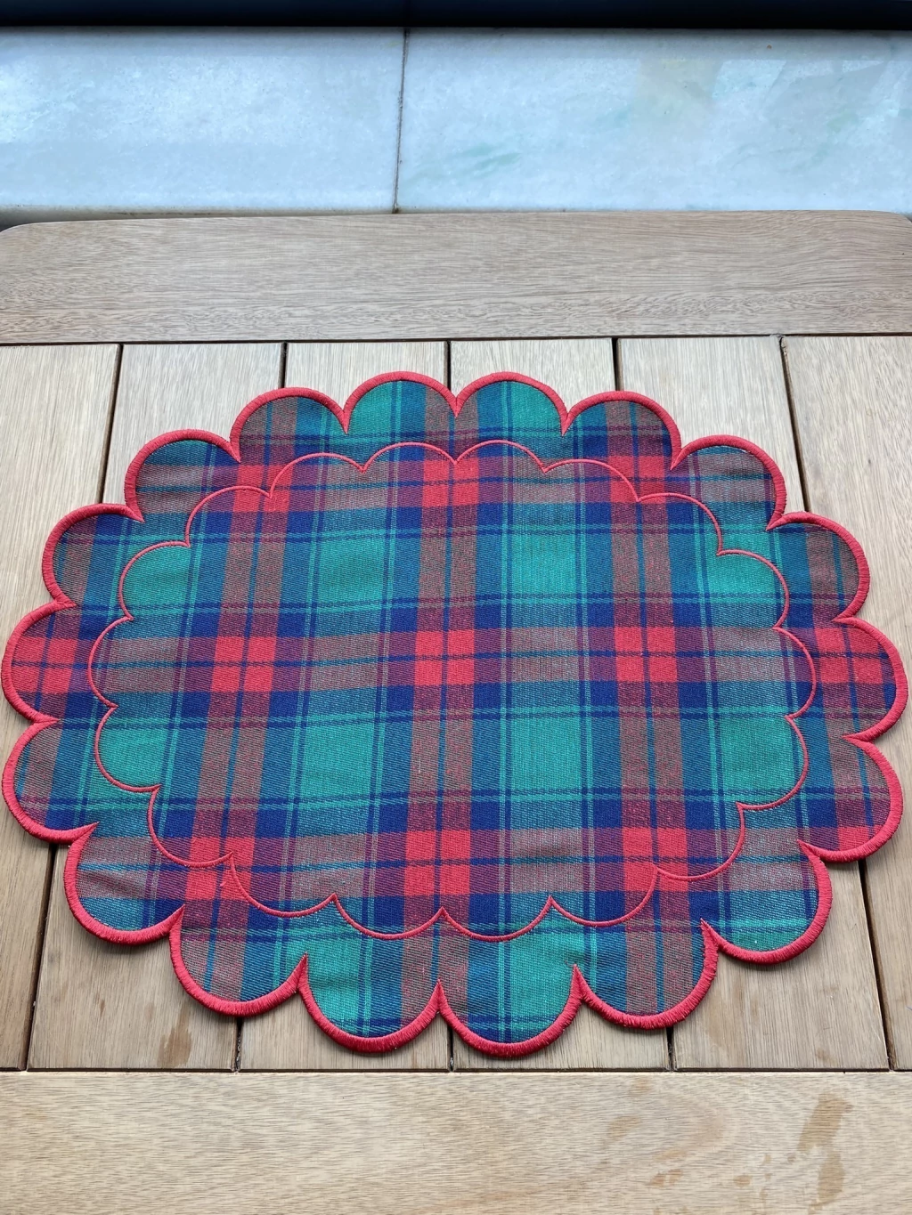 Face Xadrez Tartan Festivo: Um lado apresenta o clássico padrão xadrez (Tartan) em tons de verde-pinho, vermelho escarlate e toques de azul-marinho/preto. Essa estampa é sinônimo de aconchego, tradição e Natal, sendo perfeita para criar uma mesa vintage ou rústica-chique.