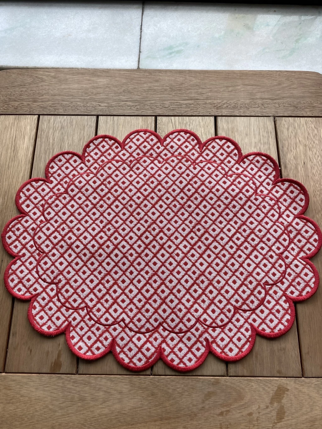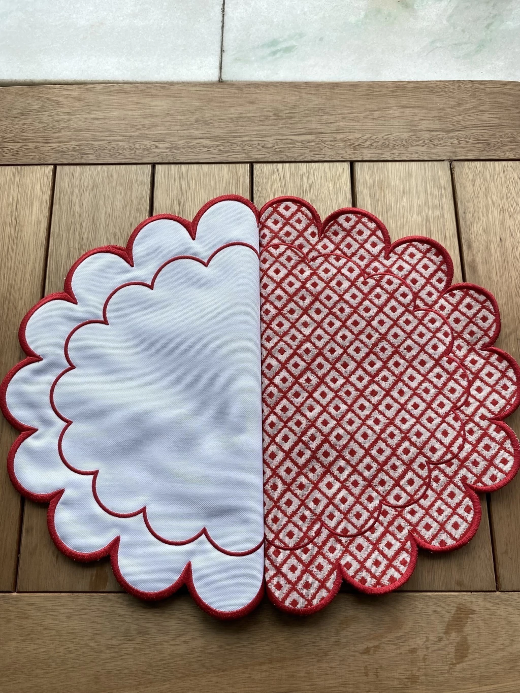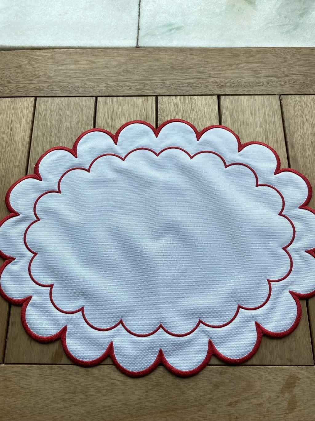 O design é marcado pelo seu formato oval e alongado, com uma borda ondulada que lembra pétalas de flores ou uma nuvem suave. Todo o contorno é finalizado com um viés ou costura em vermelho vibrante, garantindo estrutura e um acabamento festivo.