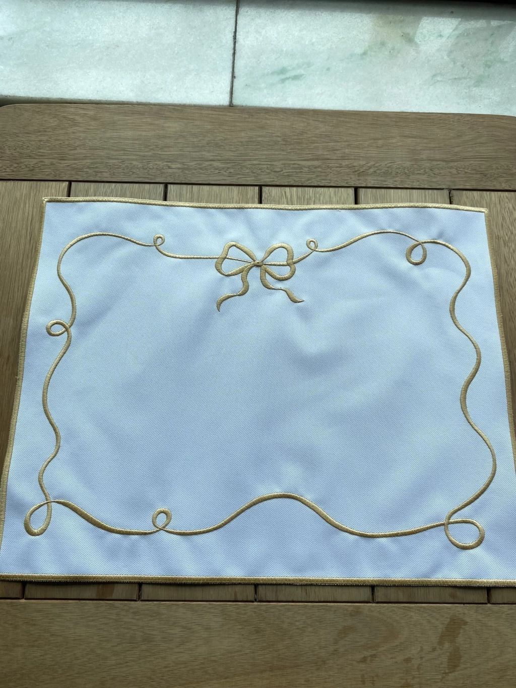 Acabamento: As bordas da peça são elegantemente finalizadas com um viés ou costura simples na cor do tecido, emoldurado por uma fita fina dourada na junção, reforçando o tema do laço.