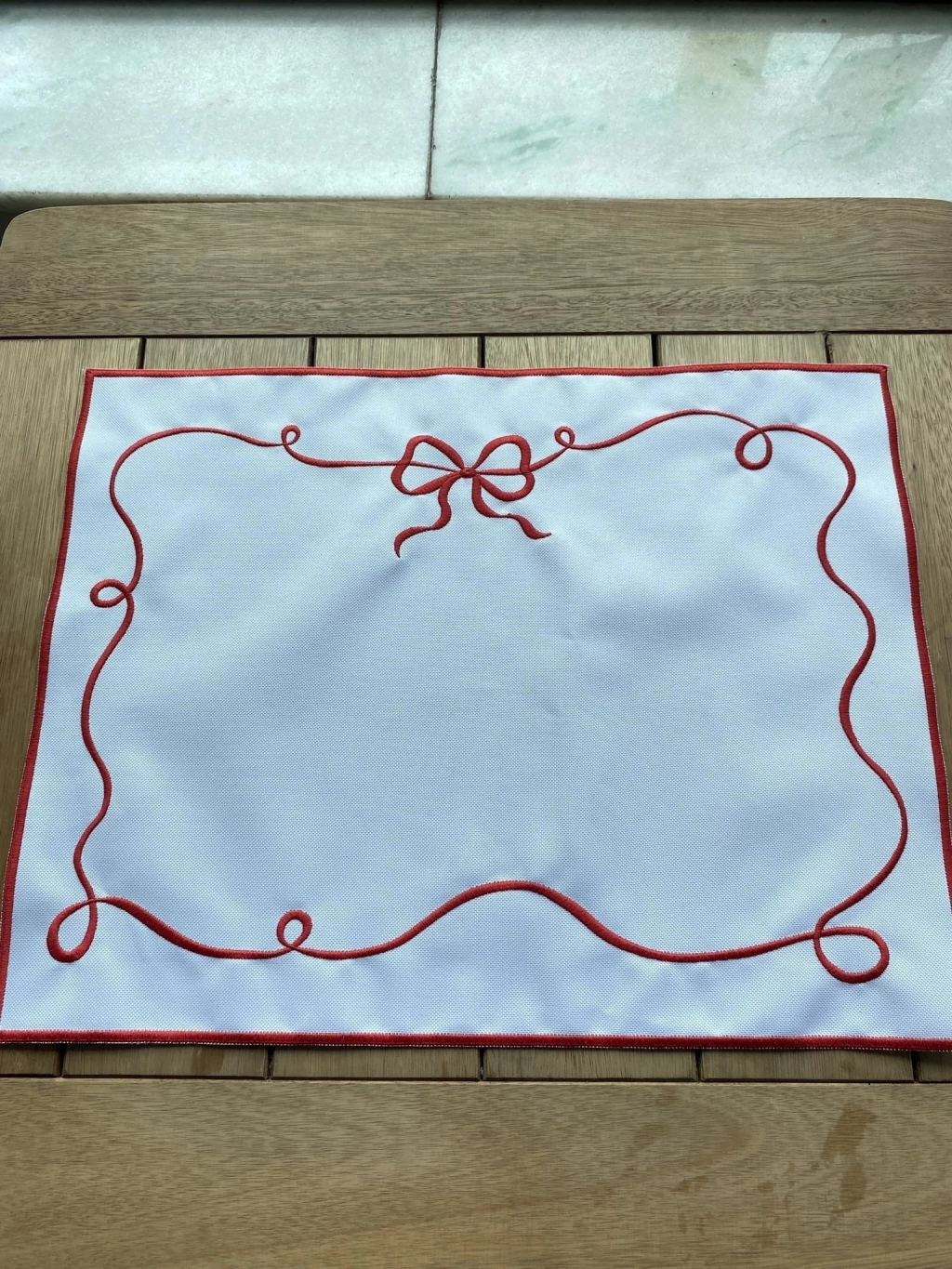 Acabamento: As bordas externas da peça são finalizadas com um viés ou costura em vermelho, garantindo um acabamento nítido e reforçando a cor temática da peça.