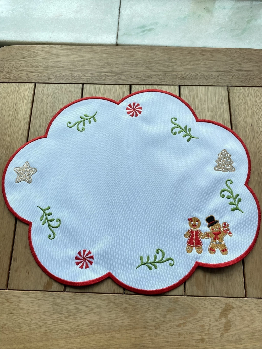 Elementos Festivos: O bordado é complementado por desenhos de folhagens verdes, estrelas douradas, árvores de Natal estilizadas e doces redondos (como balas de hortelã), espalhados harmoniosamente pelo campo branco.