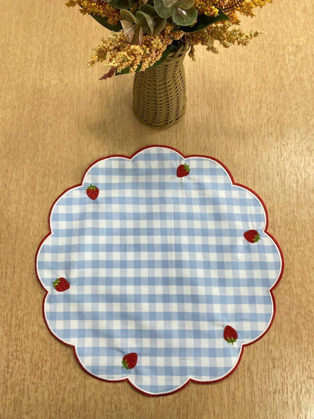 Delicado e encantador, o Lugar Americano Moranguinho Azul Bordado é a escolha perfeita para uma mesa posta com clima de doçura e charme campestre. Com estampa xadrez em tom azul claro, bordado de moranguinhos e acabamento em borda ondulada com viés vermelho, ele combina um visual romântico e alegre. Ideal para cafés da manhã especiais, brunchs ou piqueniques com estilo, essa peça transforma qualquer refeição em um momento acolhedor e cheio de personalidade.