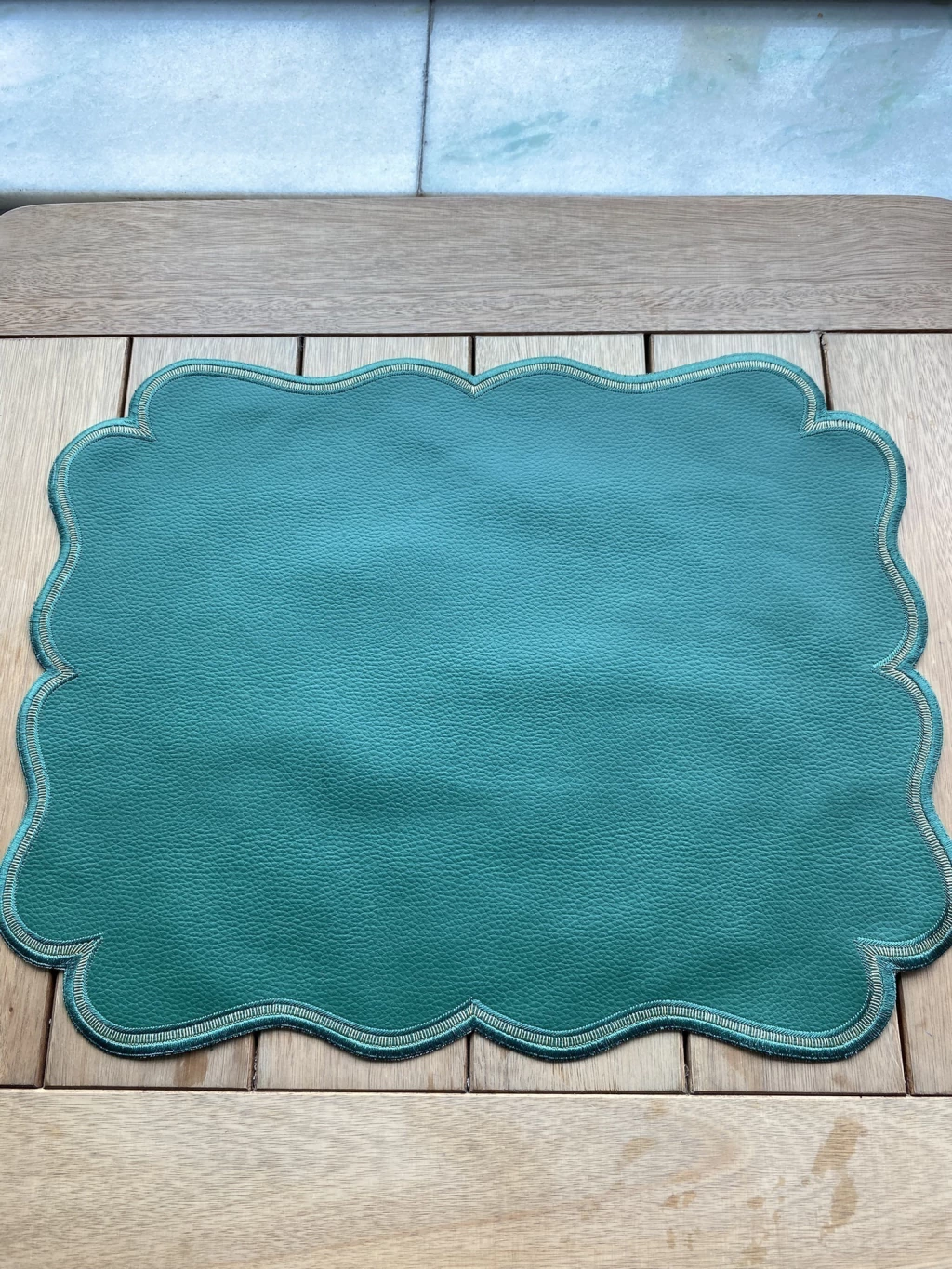 Toque Dourado: O detalhe premium e mais marcante é o bordado em linha dourada que contorna o design interno da peça. Esta linha cria a ilusão de uma moldura fina e luxuosa, destacando o formato ondulado e adicionando um ponto de brilho e requinte.
