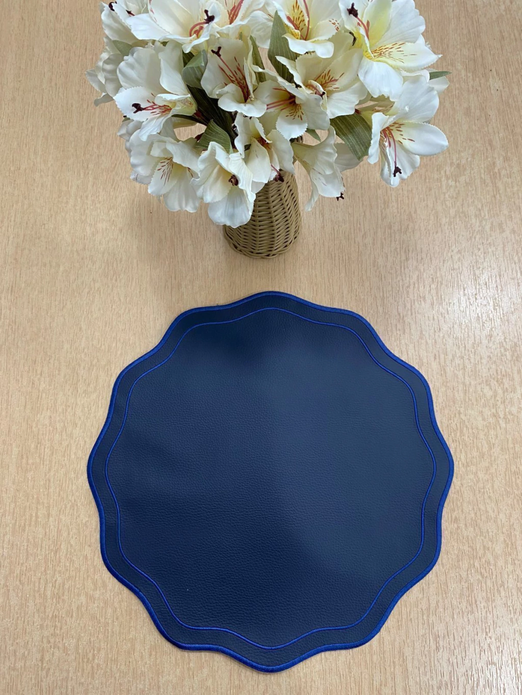 Este lugar americano de courino na cor azul marinho tem um design clássico e elegante. O formato redondo e as bordas onduladas, acentuadas por um bordado duplo em pesponto de um tom de azul um pouco mais claro, dão um toque de sofisticação e modernidade à peça. É ideal para quem busca uma opção versátil e durável para decorar a mesa com estilo.