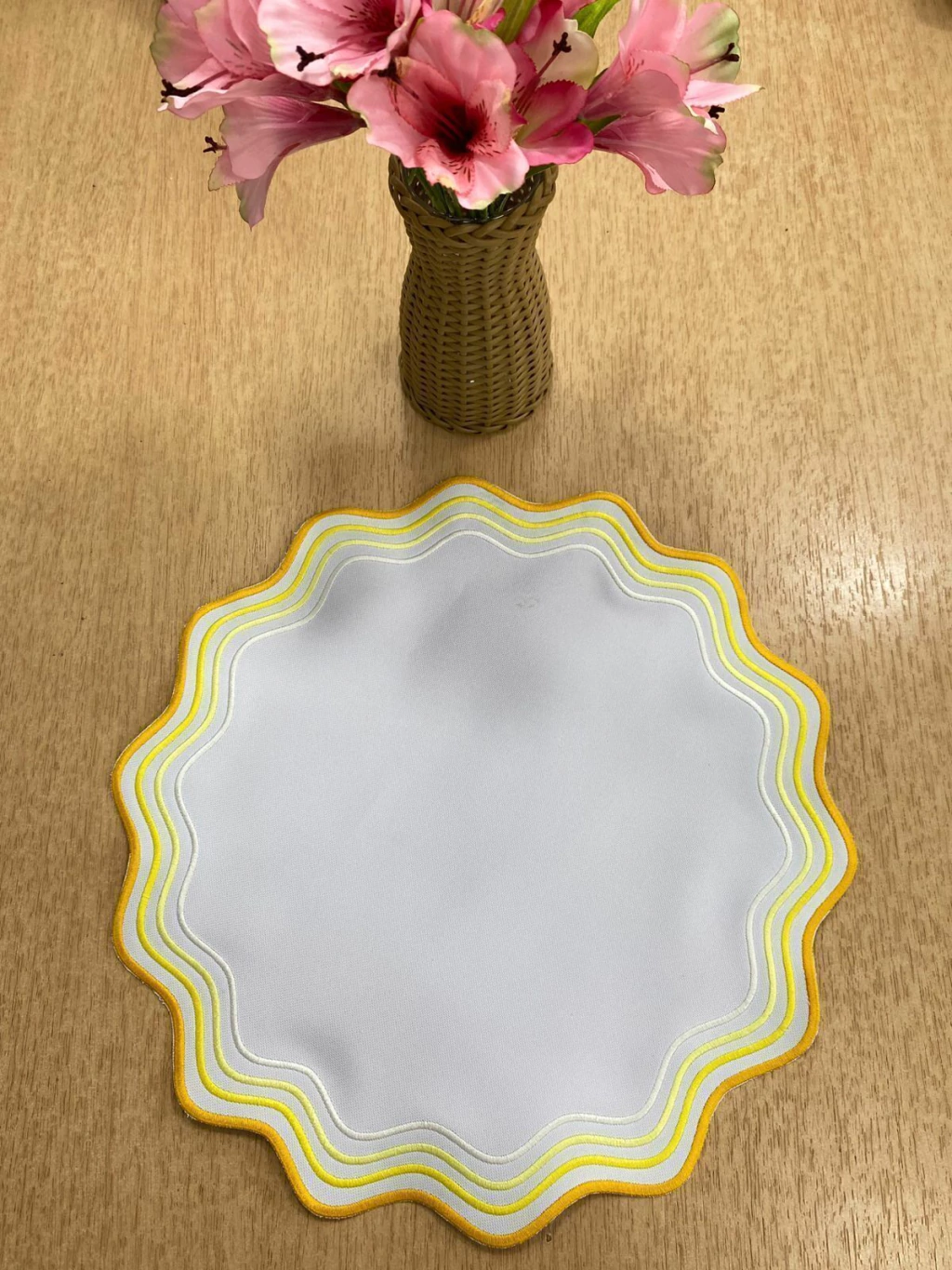 Ilumine sua mesa com o vibrante Lugar Americano Trama Solar Amarelo. Seu design exclusivo, com bordas onduladas que lembram raios de sol, é destacado por um elegante bordado em três tons de amarelo (amarelo claro, amarelo e mostarda) sobre o fundo branco. Este item traz uma energia radiante e um toque de alegria para qualquer refeição. Confeccionado em tecido de alta qualidade, ele protege sua mesa com estilo e é a escolha perfeita para criar uma atmosfera moderna e cheia de vida.