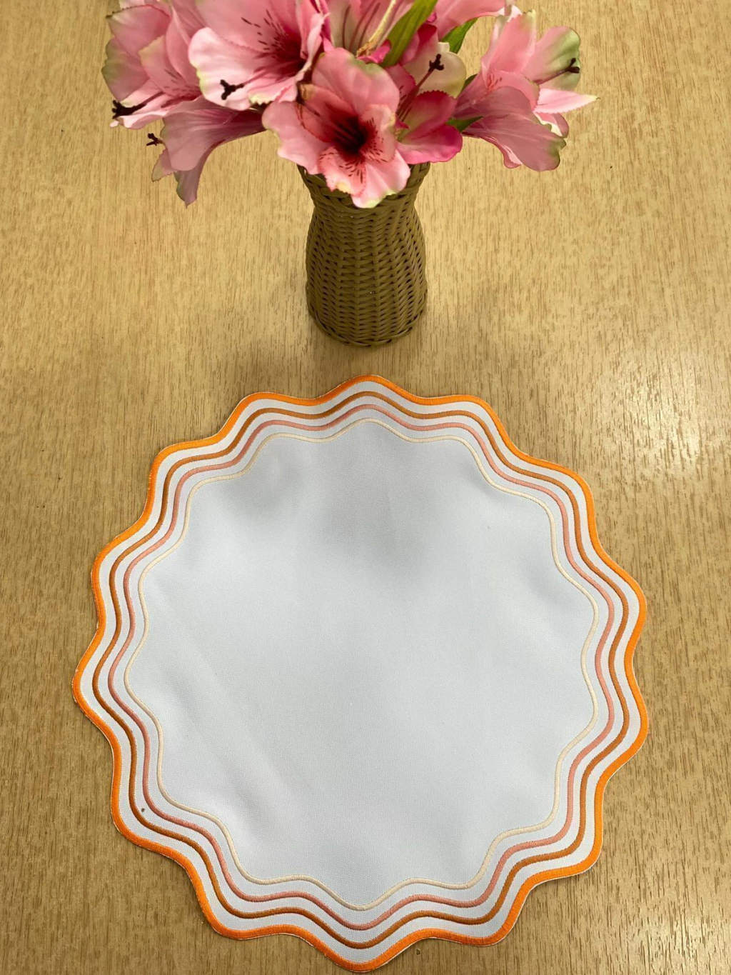 Adicione um toque de calor e vitalidade à sua mesa com o Lugar Americano Trama Solar Laranja. Com um design exclusivo de bordas onduladas que evocam raios de sol, este lugar americano é destacado por um elegante bordado em três tons de laranja (laranja, coral e pêssego) sobre um fundo branco. Perfeito para criar uma atmosfera alegre e acolhedora, ele é feito em tecido de alta qualidade, garantindo durabilidade e um visual moderno. Ideal para quem busca uma decoração que combine estilo e energia.