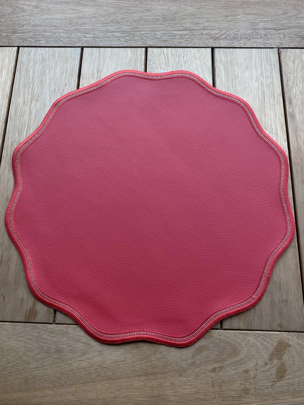 Costura: A borda ondulada é finalizada com uma costura decorativa em zigue-zague em cor dourada. Este detalhe de contraste destaca o formato "wave" e confere um acabamento artesanal e de alta durabilidade ao produto.