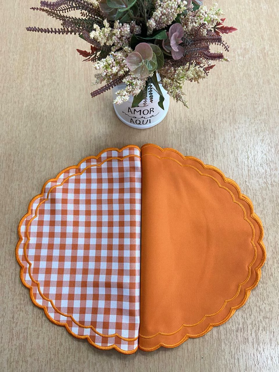 Sua funcionalidade dupla-face oferece a praticidade de dois visuais em um único produto. De um lado, a peça apresenta uma tonalidade de laranja vibrante e lisa, ideal para criar uma composição moderna e cheia de energia. Ao virá-lo, a icônica estampa xadrez gingham em laranja e branco confere um ar alegre e acolhedor, perfeito para refeições casuais, brunches ou decorações de outono.