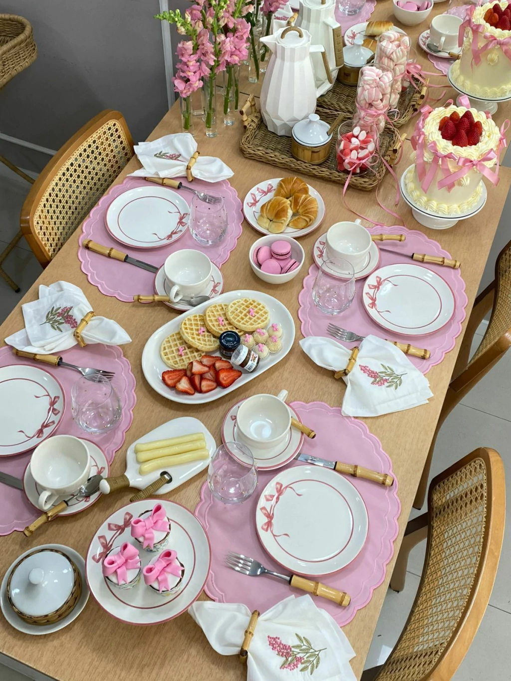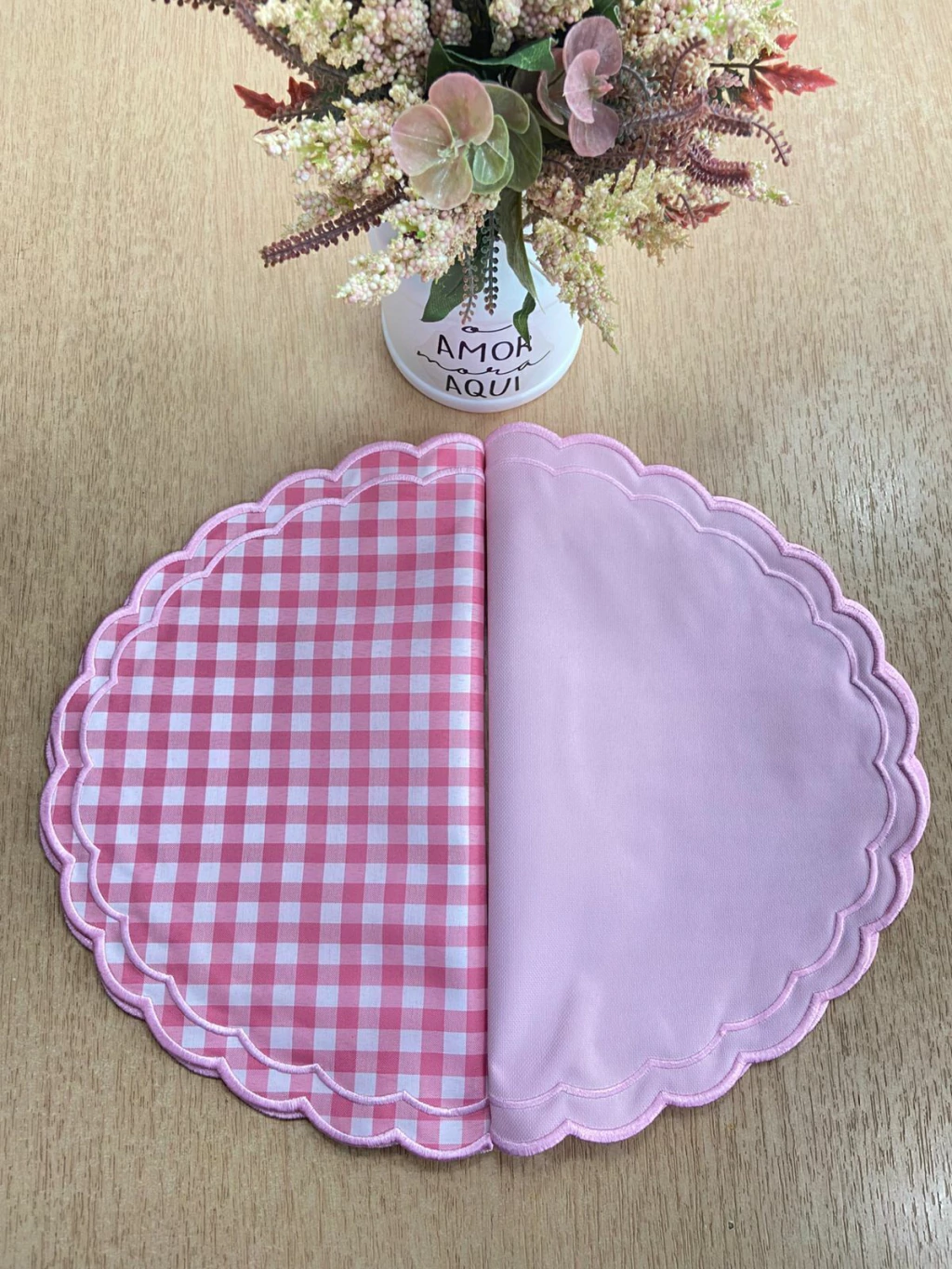 Com um design dupla-face, ele oferece a praticidade de dois visuais em um só produto. De um lado, uma superfície lisa em rosa-claro, que transmite delicadeza e elegância, perfeita para composições mais minimalistas e românticas. Do outro, a clássica estampa xadrez gingham em rosa e branco, que evoca um estilo campestre, alegre e acolhedor. Este padrão é ideal para criar uma atmosfera descontraída, perfeita para um café da manhã especial, um brunch ou um chá da tarde.
