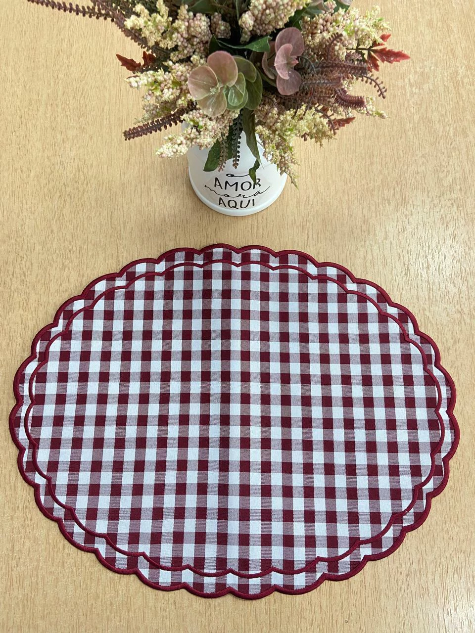 Com um design dupla-face, ele apresenta de um lado um tecido liso em um tom sofisticado de vinho, ideal para criar uma atmosfera mais formal e acolhedora. Ao virá-lo, revela uma charmosa estampa xadrez gingham em tons de vinho e branco, perfeita para adicionar um toque rústico, alegre e convidativo à sua refeição.