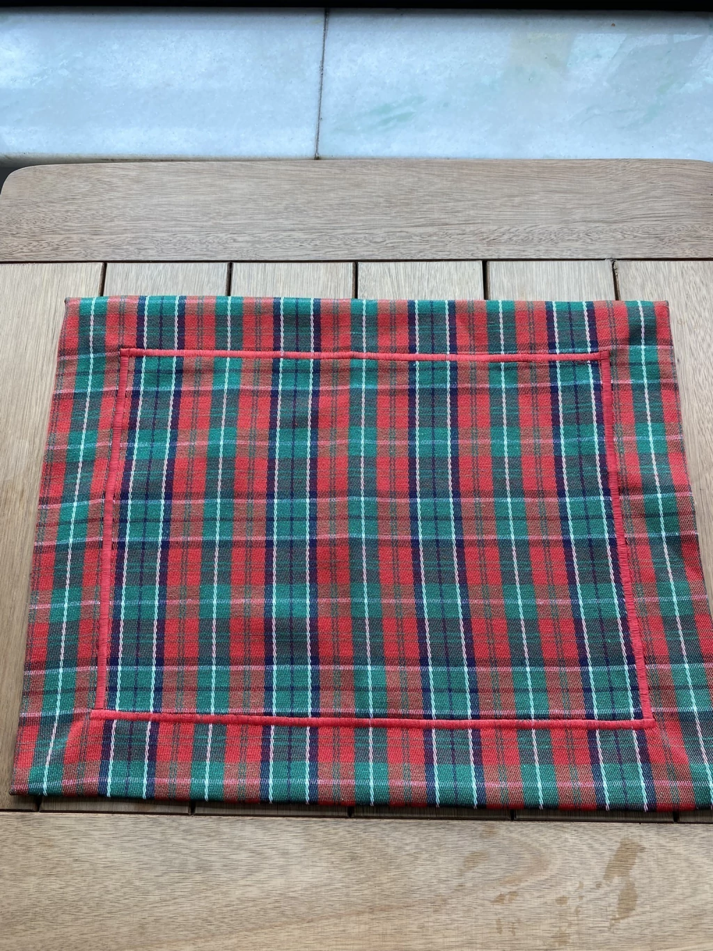 O design é finalizado com um acabamento interno que simula uma moldura para o prato. Esta moldura é criada por uma linha ou viés de cor vermelha vibrante que corre paralela às bordas, adicionando um toque de refinamento e destacando o centro da peça. As bordas externas são simples e costuradas, focando toda a atenção na rica estampa xadrez.