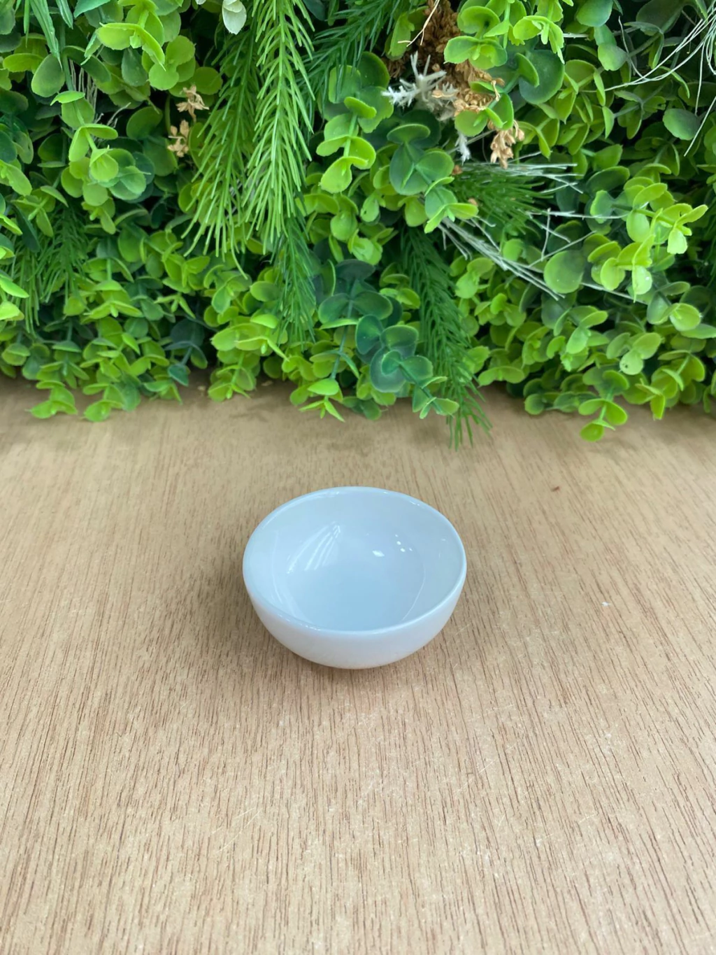Mini molheira redonda, na cor branca e com acabamento liso e brilhante. A peça tem um formato de tigela pequena, ideal para servir porções individuais de molhos, azeites, shoyu ou outros condimentos. Seu design minimalista e compacto a torna uma adição prática e elegante à mesa, perfeita para refeições de sushi, petiscos ou churrascos.