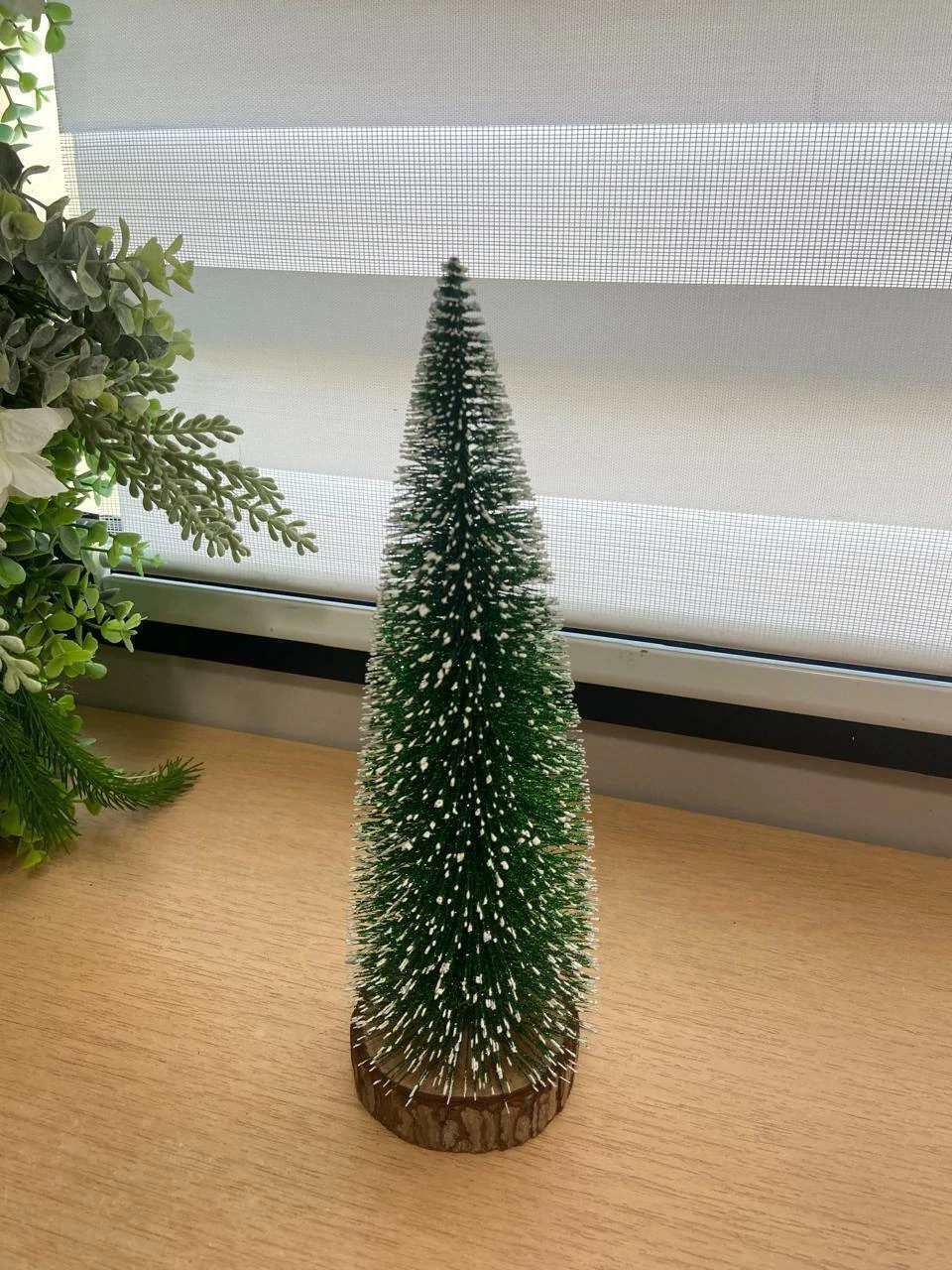 Com um formato cônico clássico, ele simula um pinheiro coberto por uma delicada camada de neve nas pontas dos galhos, criando um visual elegante e festivo. A base de madeira confere estabilidade e um toque rústico, permitindo que a peça seja usada em qualquer superfície plana, como prateleiras, mesas de centro ou lareiras