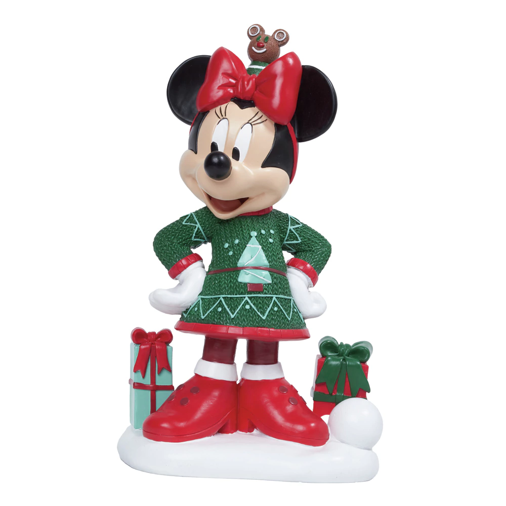 A estatueta da Minnie Mouse está em pé sobre uma base de neve com caixas de presente. Ela veste um suéter verde com a estampa de um pinheiro e a cabeça de um biscoito de gengibre decora seu laço vermelho. Com acabamento detalhado, esta miniatura é ideal para enfeitar prateleiras, mesas de centro ou qualquer cantinho que precise de um toque de alegria e nostalgia.
