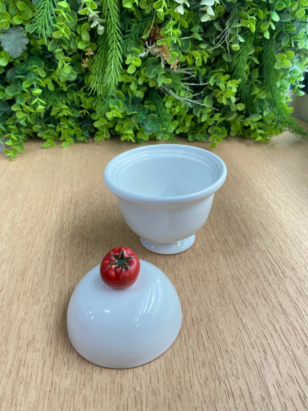 A tampa, que se encaixa perfeitamente na tigela, possui uma pequena alça esférica na cor vermelho-brilhante, que imita um tomate. O contraste entre o branco da cerâmica e o vermelho do tomate na alça dá um toque de cor e criatividade à peça.
