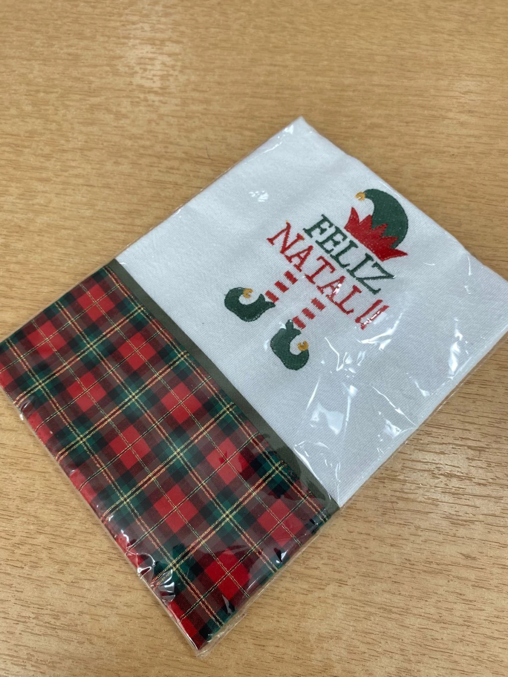 Design: O item mescla o tradicional padrão xadrez com um bordado alegre e moderno, caracterizado por elementos visuais do Duende (Elfo) de Natal.