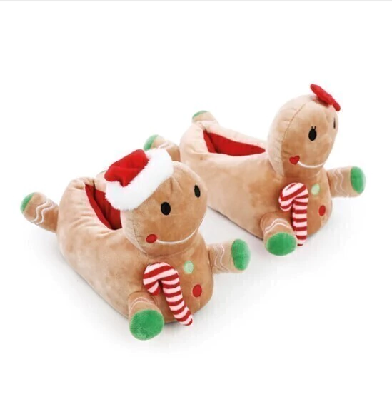 O item é um par adorável de pantufas de pelúcia projetadas para manter os pés quentinhos e confortáveis, com o formato temático de bonecos de biscoito de gengibre, ideal para a época natalina ou para os meses mais frios.