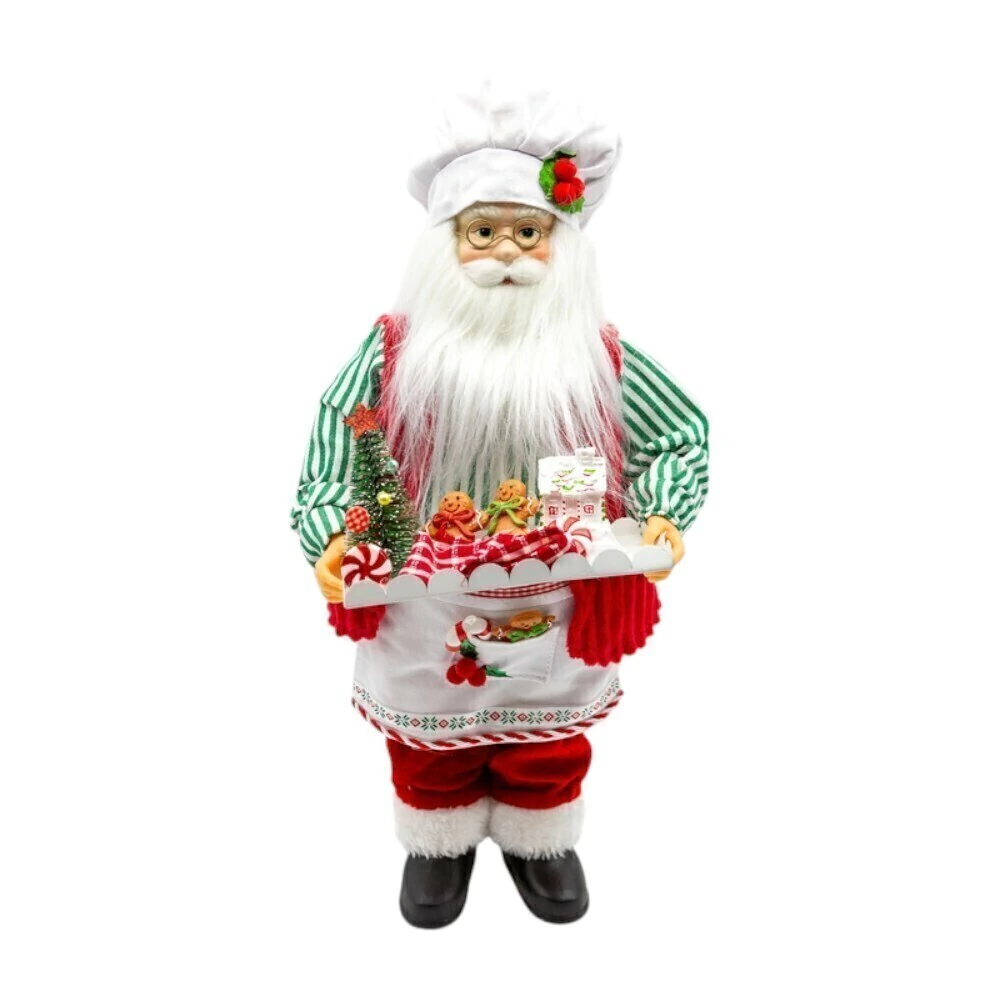 Nas mãos, ele segura uma bandeja branca cheia de guloseimas de Natal. Nela, podemos ver uma pequena árvore de Natal, um biscoito de gengibre em formato de boneco, um rolo de massa com listras vermelhas e brancas, e um pequeno bolo ou casinha de gengibre com cobertura branca.