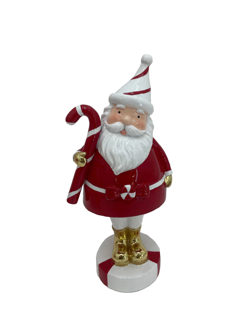 1. O Charme da Bengala Doce O grande destaque desta peça é a Bengala Doce (Candy Cane) que o Papai Noel segura firmemente. A bengala, nas tradicionais cores listradas de vermelho e branco, é volumosa e lúdica, adicionando um elemento de doçura e fantasia à decoração. Um detalhe dourado na bengala realça o acabamento da peça.