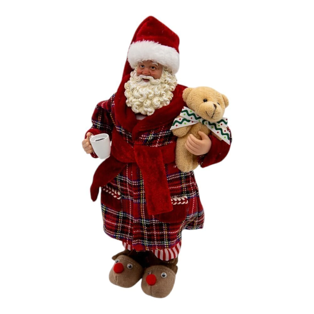 Design Exclusivo "Cozy" (Aconchegante): Longe do tradicional traje de trabalho, este Papai Noel é retratado em um momento de relaxamento. Ele veste um roupão xadrez vermelho e preto (padrão tartan), amarrado com um cinto de tecido macio, e calças listradas, sugerindo que ele acabou de acordar ou está se preparando para uma noite tranquila.