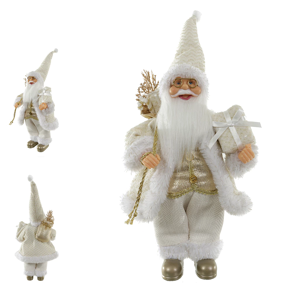 Este boneco Papai Noel é uma peça de decoração deslumbrante que evoca a elegância e o brilho das paisagens nevadas. Com um estilo luxuoso em tons de branco, creme e dourado, ele é a escolha ideal para uma decoração de Natal sofisticada e fora do tradicional vermelho.