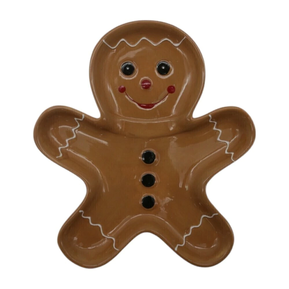 Com um acabamento brilhante, a peça traz o clássico visual do biscoito, com detalhes de glacê branco nas bordas e o rosto sorridente e botões pintados em preto e vermelho. Funcional e decorativa, é ideal para servir petiscos, doces ou biscoitos, ou até mesmo para ser usada como peça central em uma decoração temática de Natal