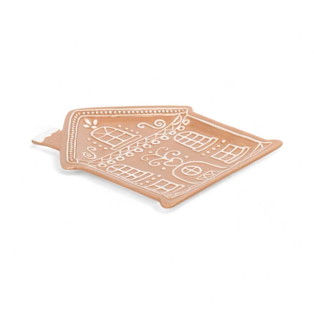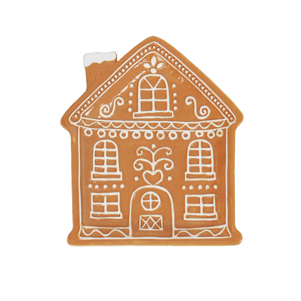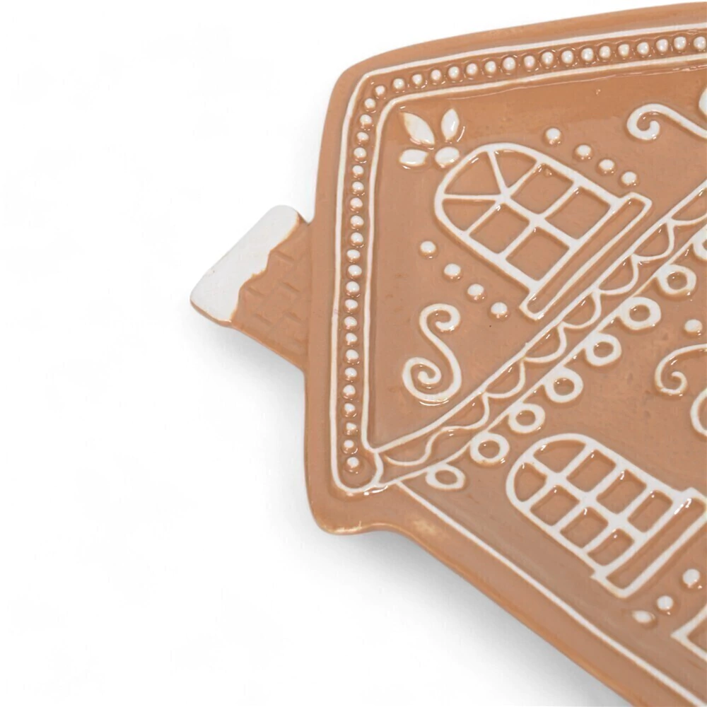 Com aproximadamente 24cm de largura, a peça tem o formato icônico de uma casinha de biscoito de gengibre. É feita em material cerâmico ou resina de alta qualidade com acabamento brilhante, na cor marrom que imita o biscoito, e ricamente decorada com detalhes em relevo brancos que simulam o glacê real. O design apresenta janelas, porta e arabescos festivos.